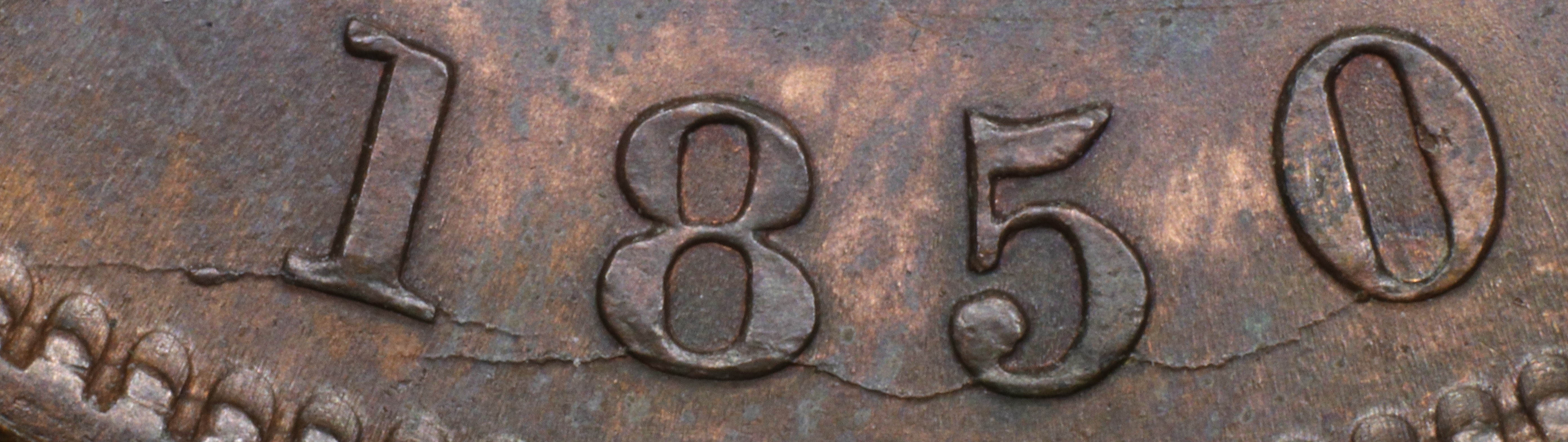 Compare the die crack detail in the *1850* area of your coin with the photos below. Remember that cracks can enlarge with die usage, so carefully compare the shape and location of the crack relative to the rim denticles and where it strikes the letter. If you find a match, click on the catalog number link above the photo to go to the home page for that catalog number. There you can check for other markers to confirm your tentative identification.