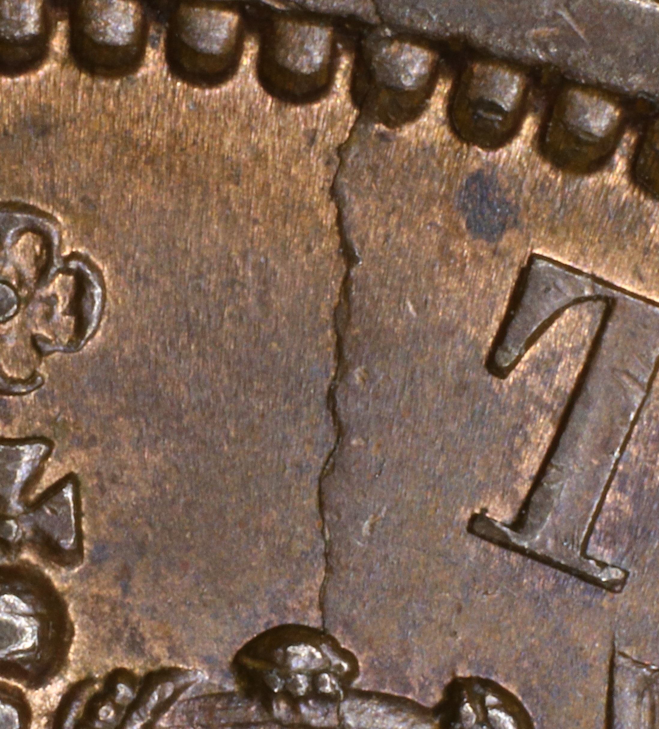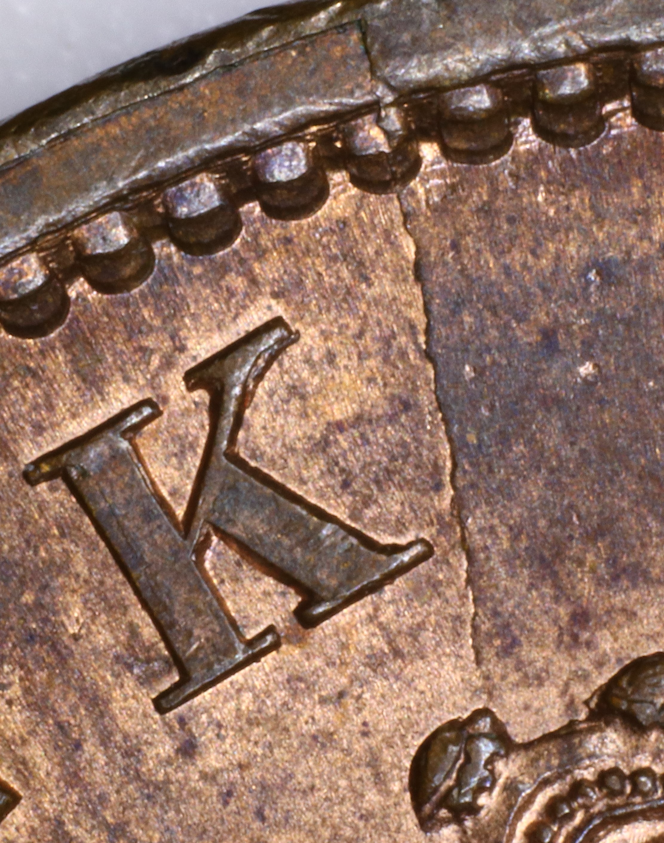 Compare the die crack detail in the Crown area of your coin with the photos below. Remember that cracks can enlarge with die usage, so carefully compare the shape and location of the crack relative to the rim denticles and where it strikes the letter. If you find a match, click on the catalog number link above the photo to go to the home page for that catalog number. There you can check for other markers to confirm your tentative identification.