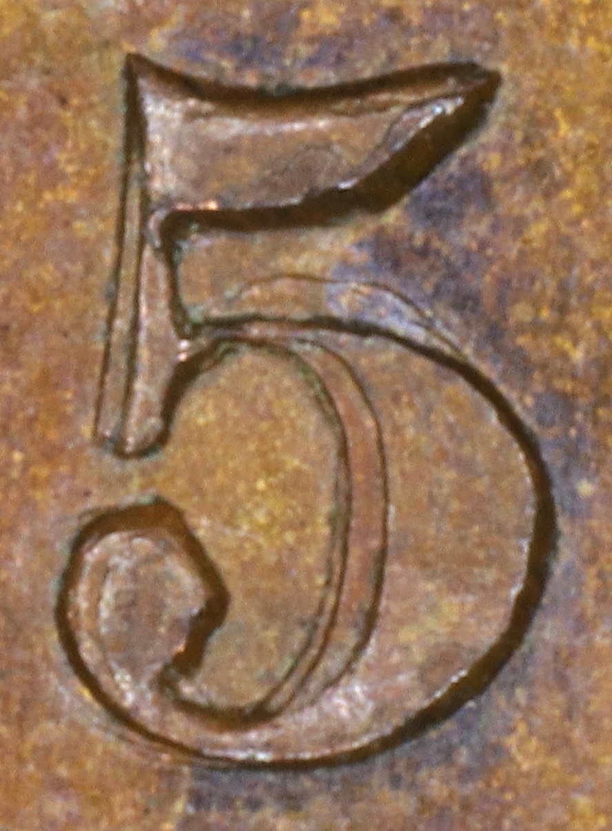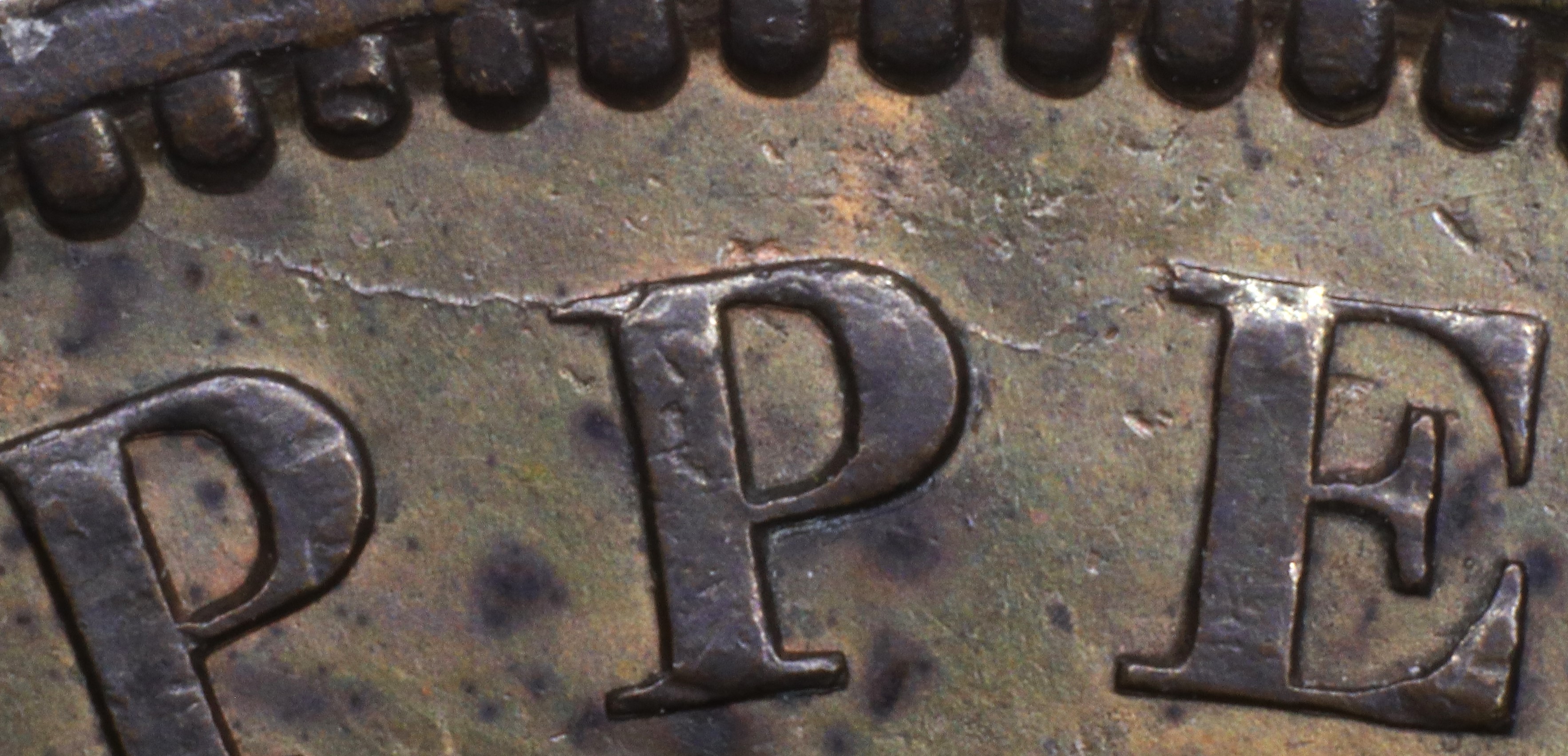 Letter color code: Black = normal, Green = broken & unrepaired, Brown = broken with noteworthy repunching