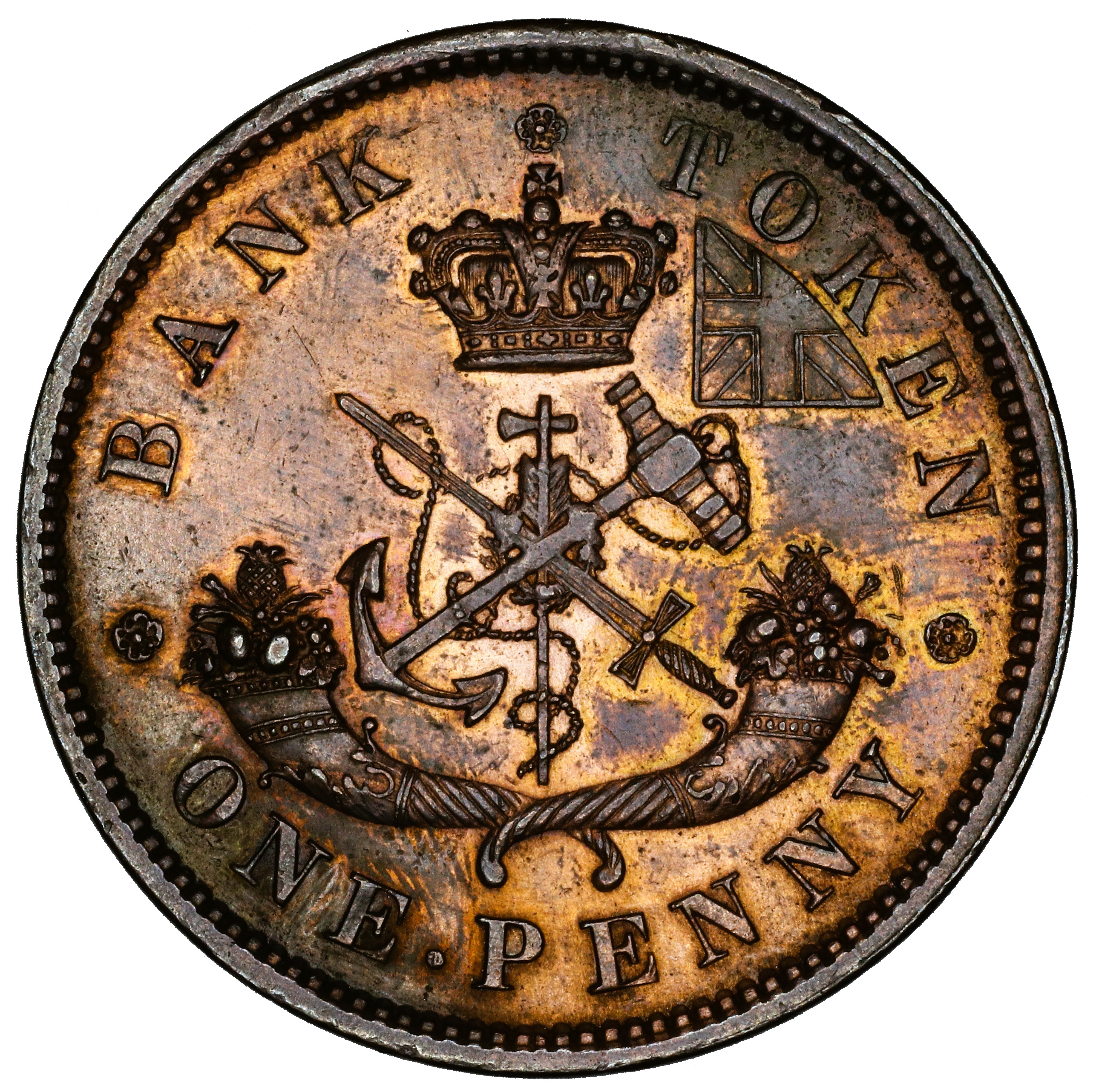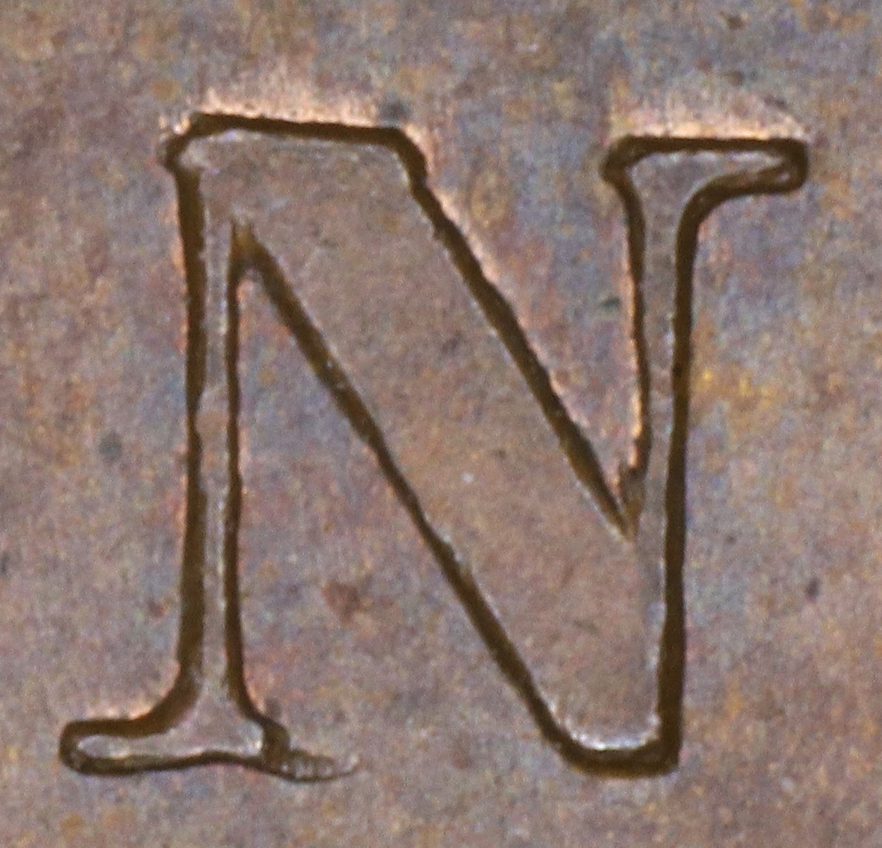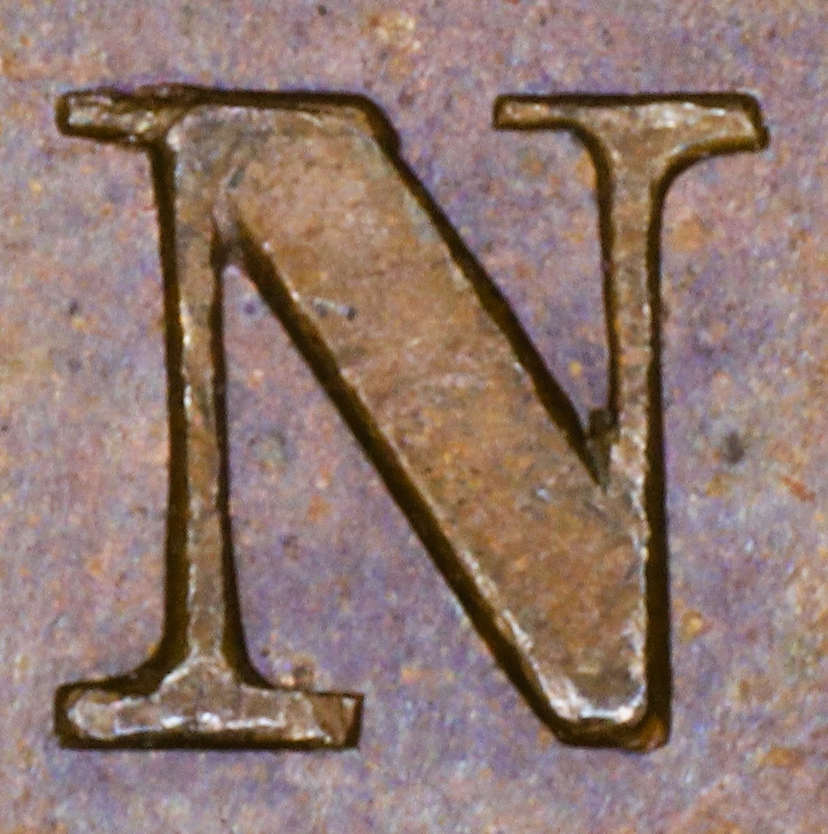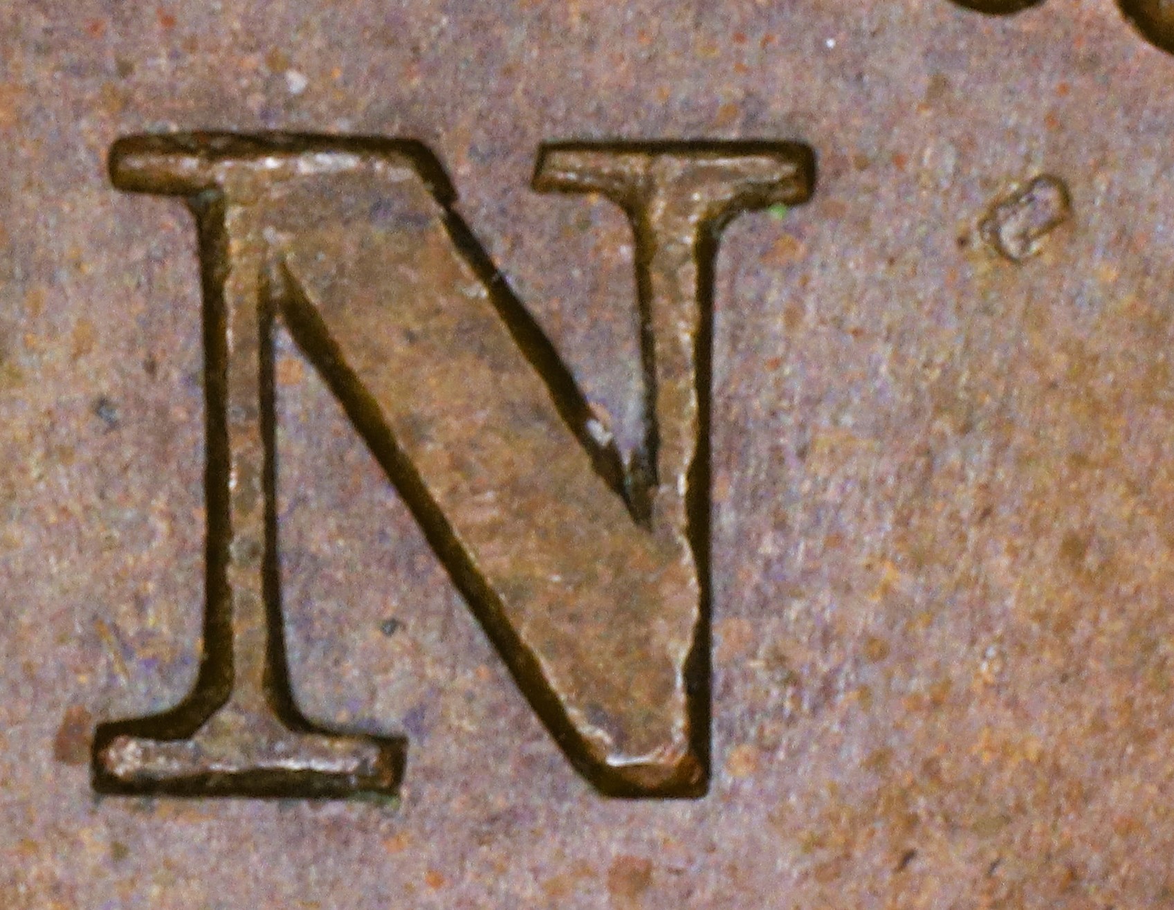 In BANK the N is repunched in lower relief in a new font with thin serifs. The upper left serif and left top of the right leg of the new font show where these features were missing in the original font.