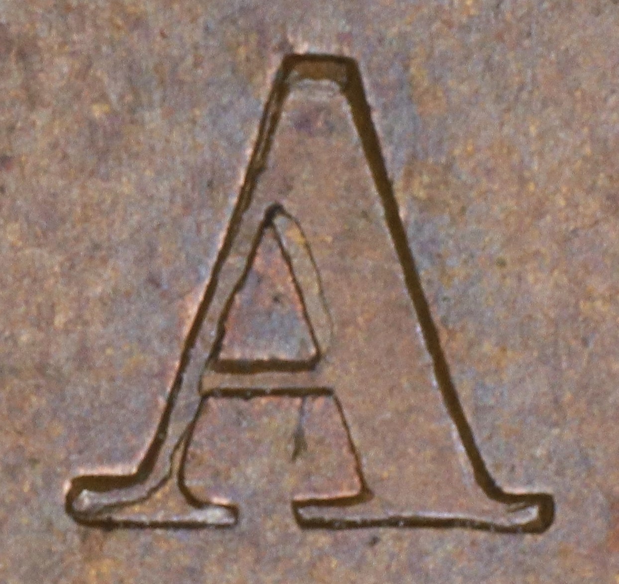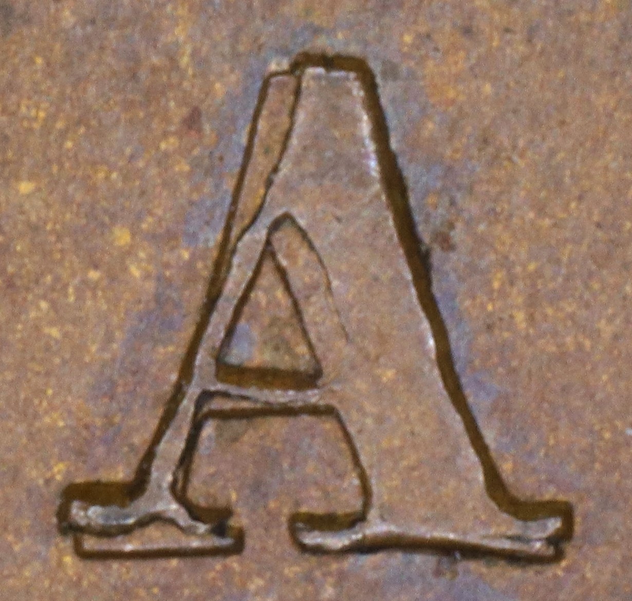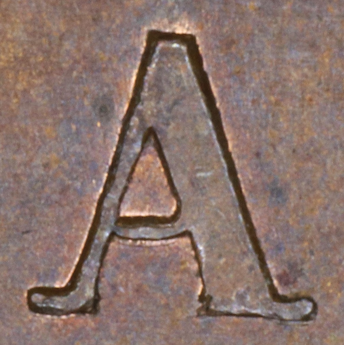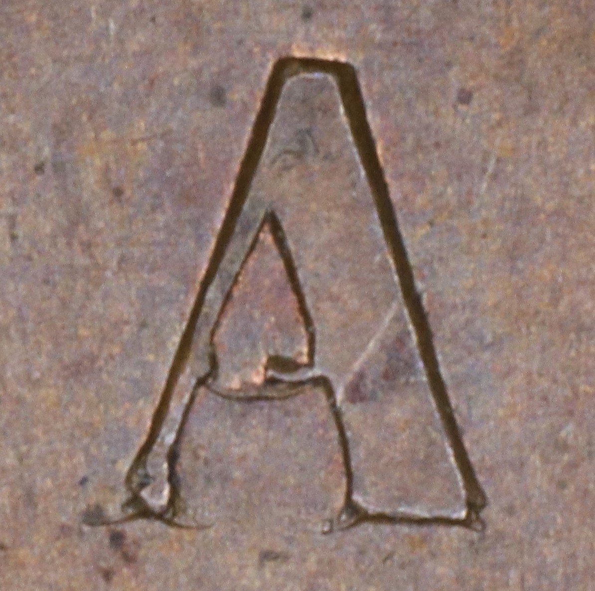 In CANADA the A has been repunched in low relief and slightly tilted compared to the original faulty letter. This causes doubling at the upper outside left of the left leg, at the left foot and along the right upright side in the central triangle.