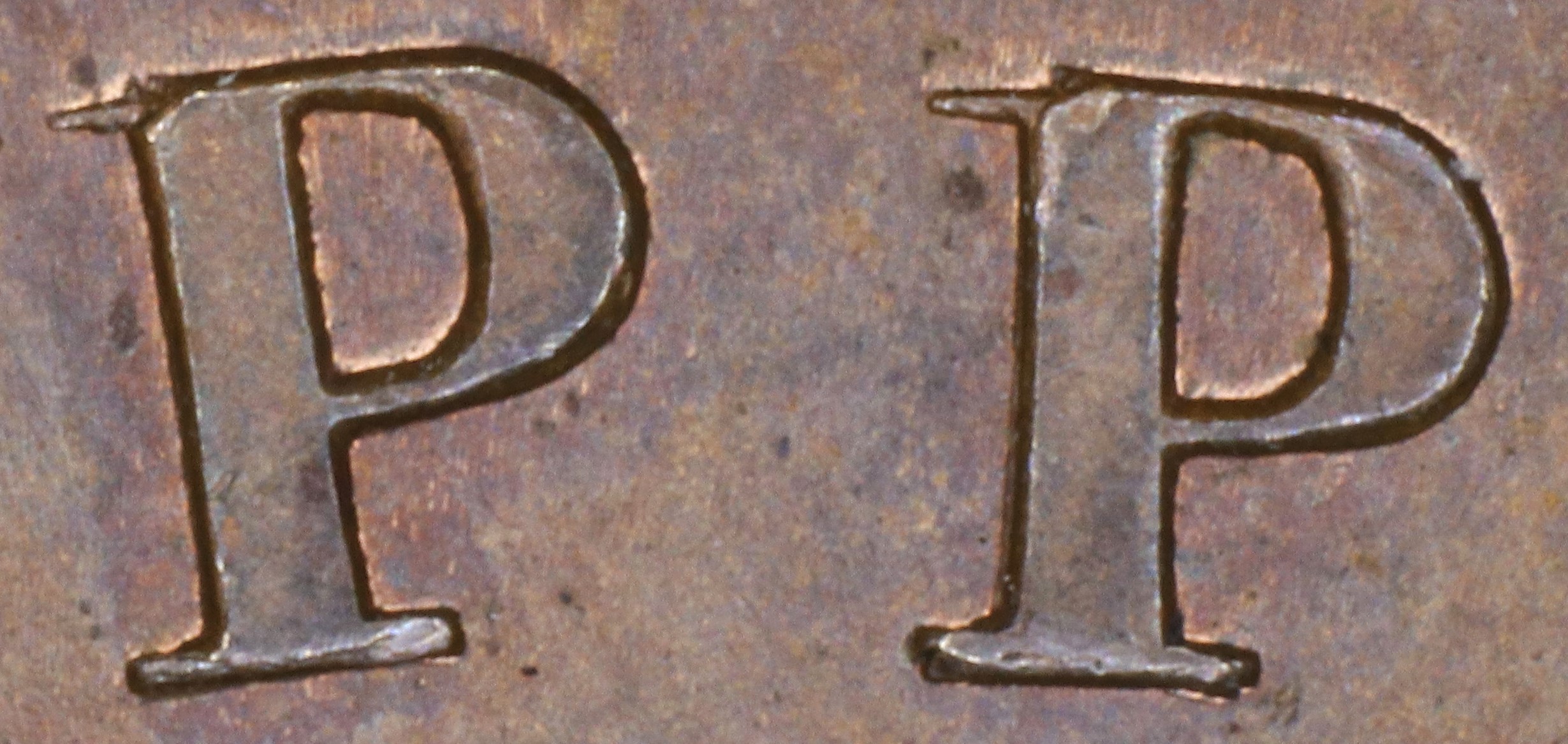 In UPPER the Ps are repunched in slightly lower relief in a new font slightly tapering upper left serifs (in the original font they were parallel). The serifs of the new font show because they had broken off the original.