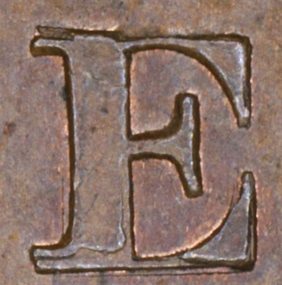 In UPPER the E is repunched in lower relief, leaving the upper left serif doubled and showing the ragged bottom of the original upright and broken lower crossbar.