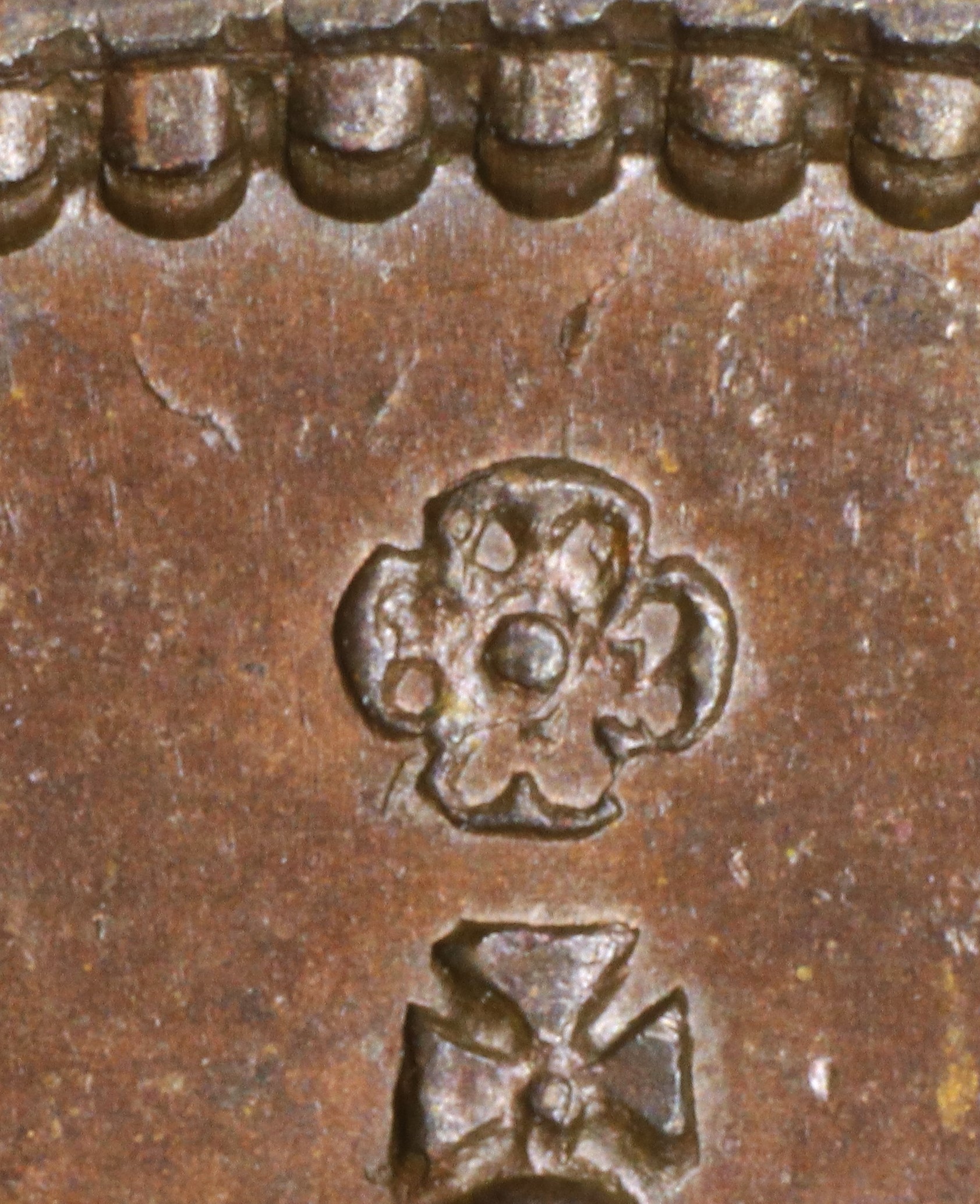 In UPPER the original E with a broken top arm has been repunched in lower relief, so that on higher grade examples one can still see the broken edges of the gap in the top arm and doubling of the upper left serif.
