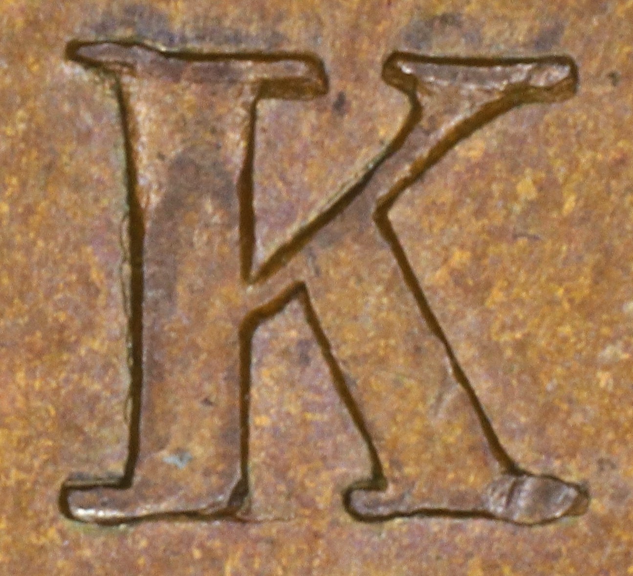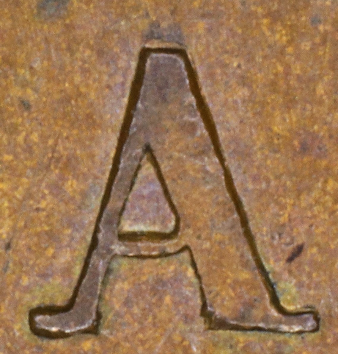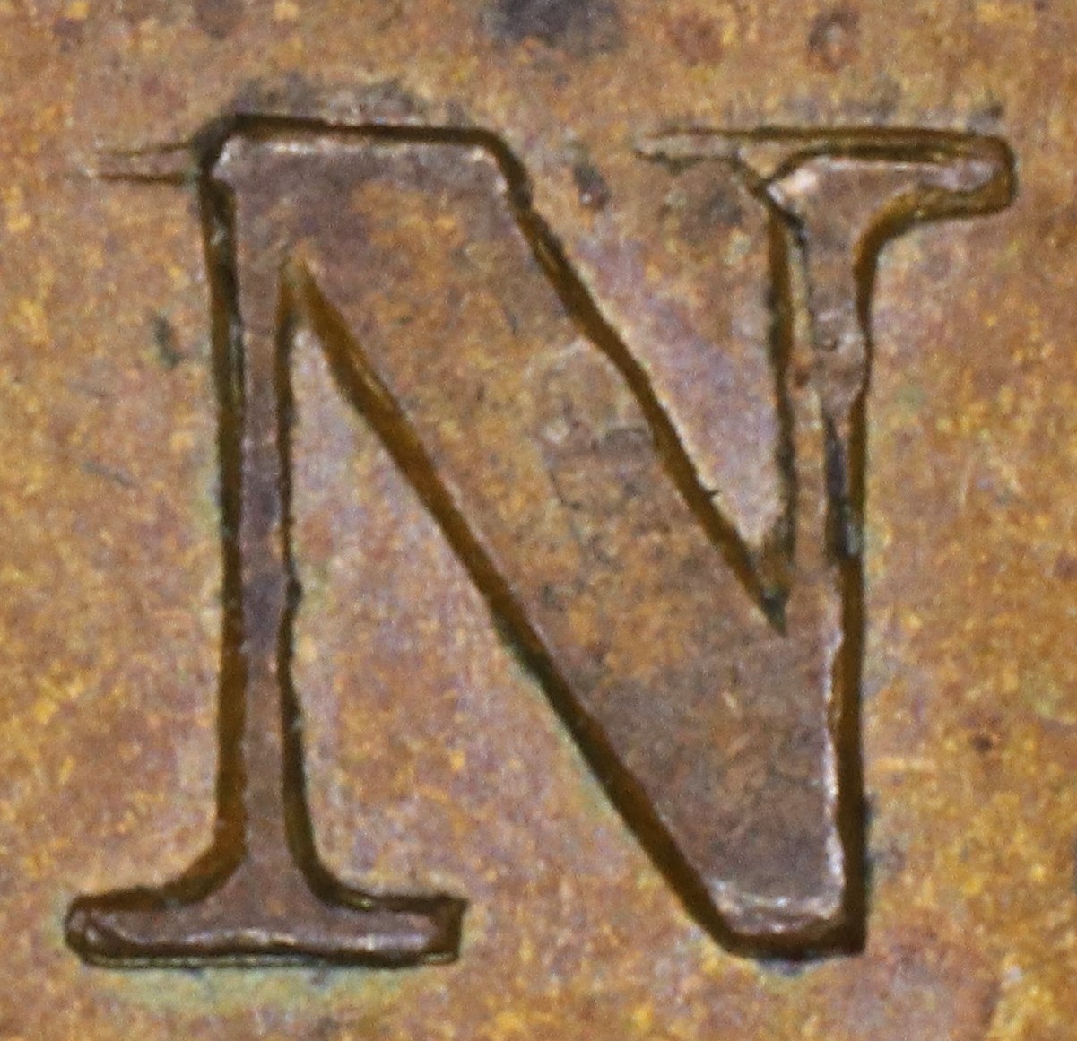 In BANK the N is repunched in slightly lower relief in a new font with very thin serifs. The serifs of the new font show in the broken areas of the original broken letter: the upper left serif and left top of the right leg.