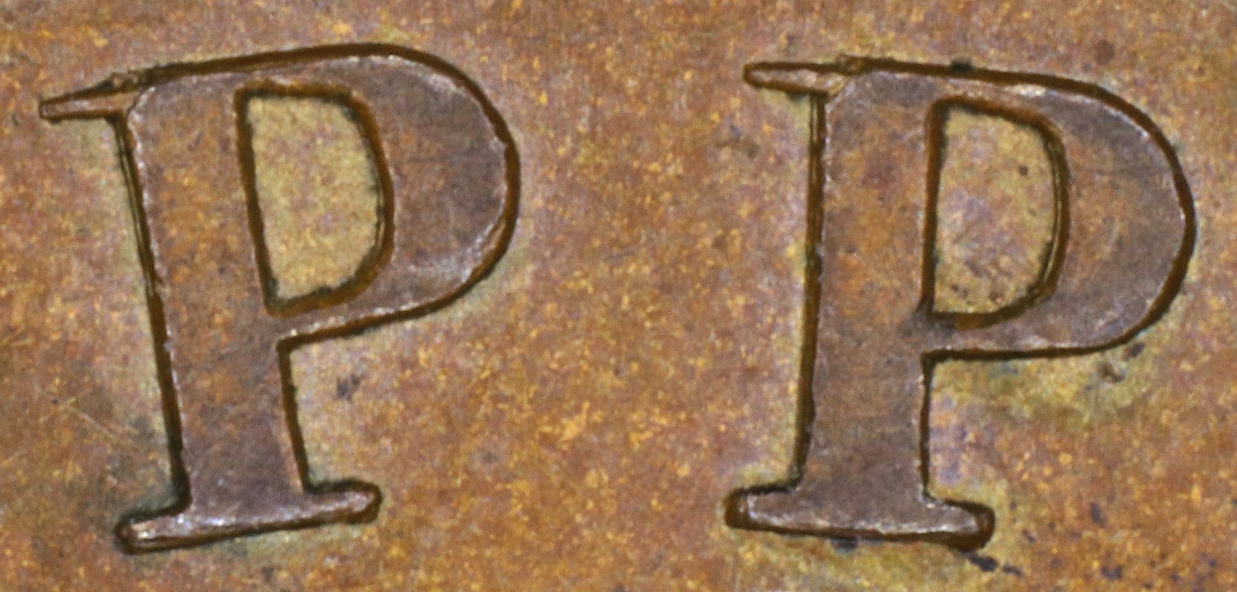 In UPPER the Ps are repunched in slightly lower relief in a new font with the UL serif of the Ps tapers (in the original font they were parallel). So, the new serifs show where the original Ps were broken.