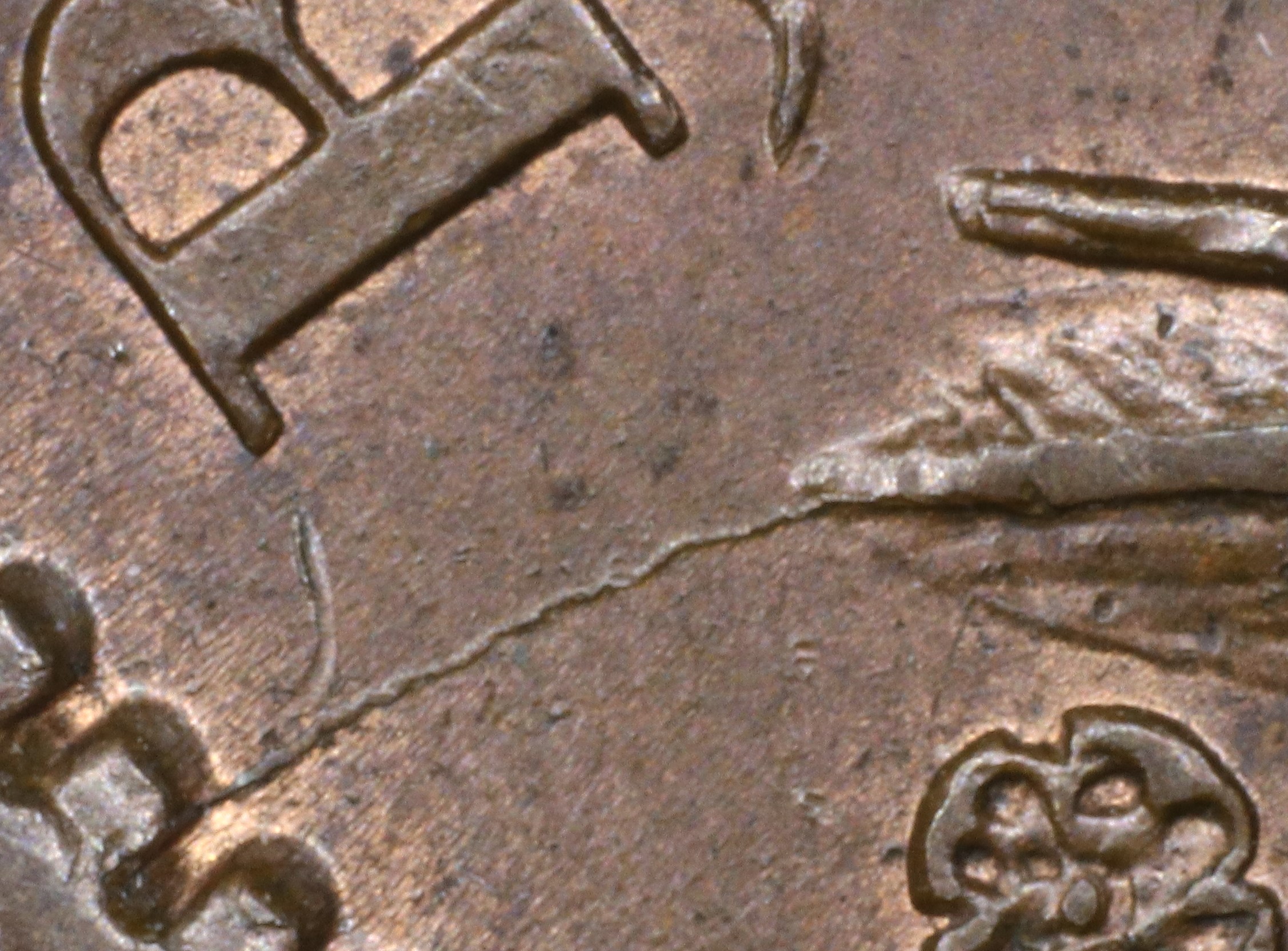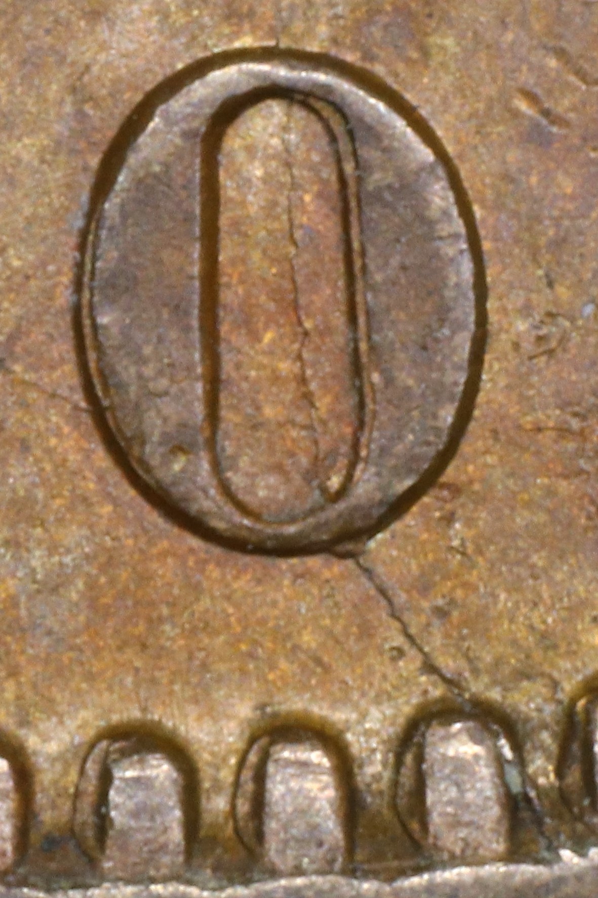 Compare the die crack detail in the *1850* area of your coin with the photos below. Remember that cracks can enlarge with die usage, so carefully compare the shape and location of the crack relative to the rim denticles and where it strikes the letter. If you find a match, click on the catalog number link above the photo to go to the home page for that catalog number. There you can check for other markers to confirm your tentative identification.