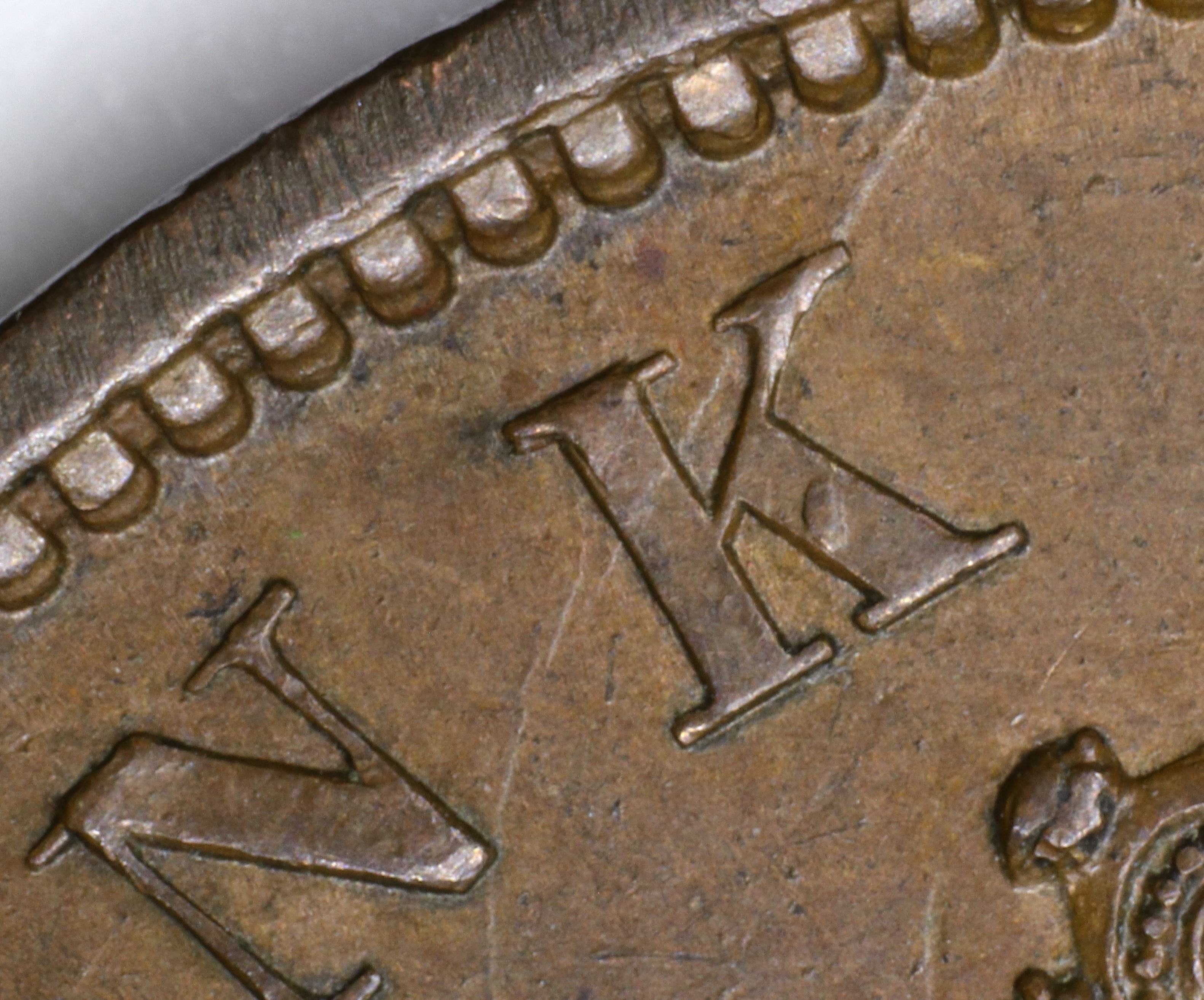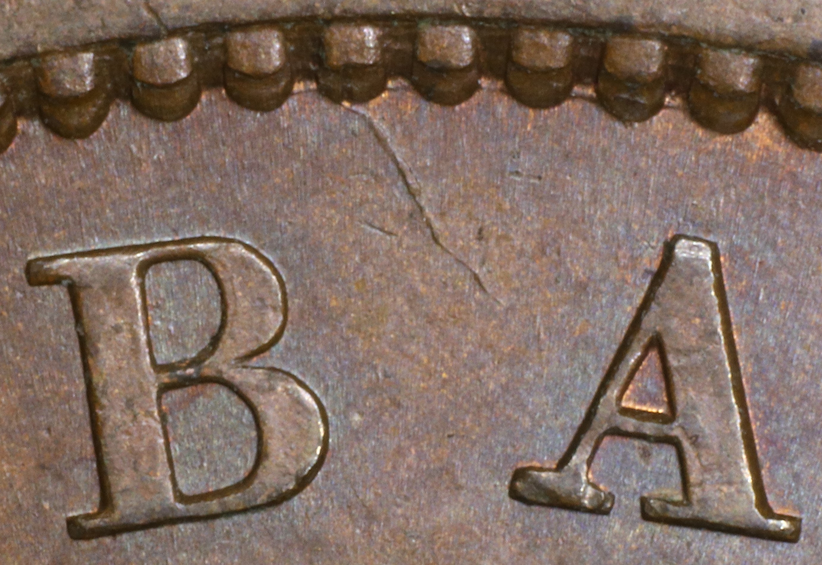 Compare the die crack detail in the BANK area of your coin with the photos below. Remember that cracks can enlarge with die usage, so carefully compare the shape and location of the crack relative to the rim denticles and where it strikes the letter. If you find a match, click on the catalog number link above the photo to go to the home page for that catalog number. There you can check for other markers to confirm your tentative identification.
