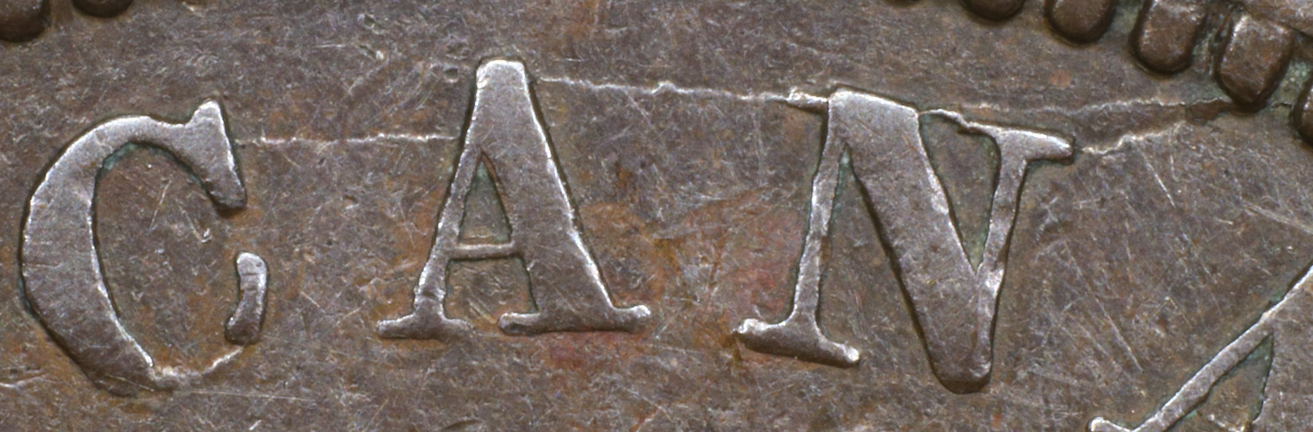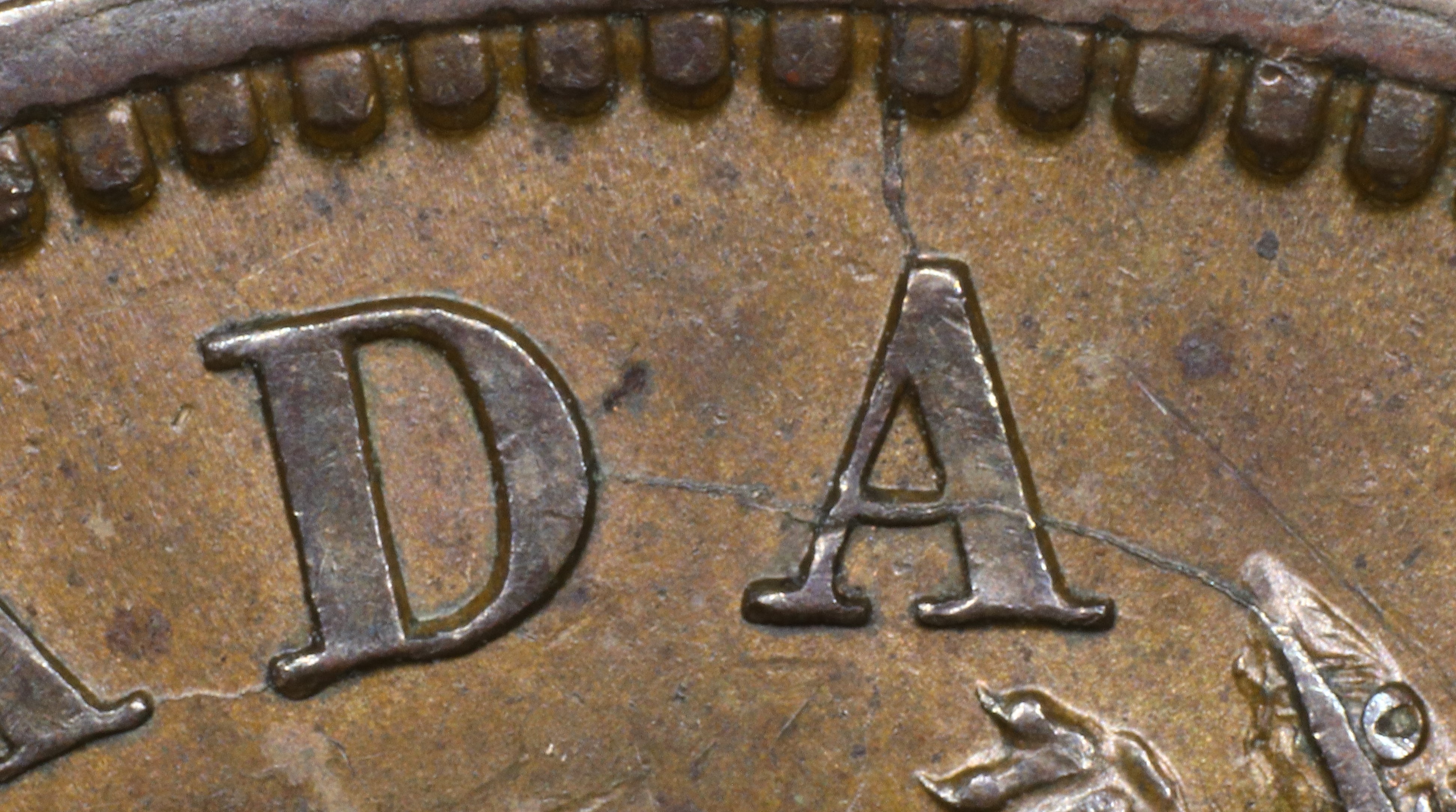 Compare the die crack detail in the CANADA area of your coin with the photos below. Remember that cracks can enlarge with die usage, so carefully compare the shape and location of the crack relative to the rim denticles and where it strikes the letter. If you find a match, click on the catalog number link above the photo to go to the home page for that catalog number. There you can check for other markers to confirm your tentative identification.
