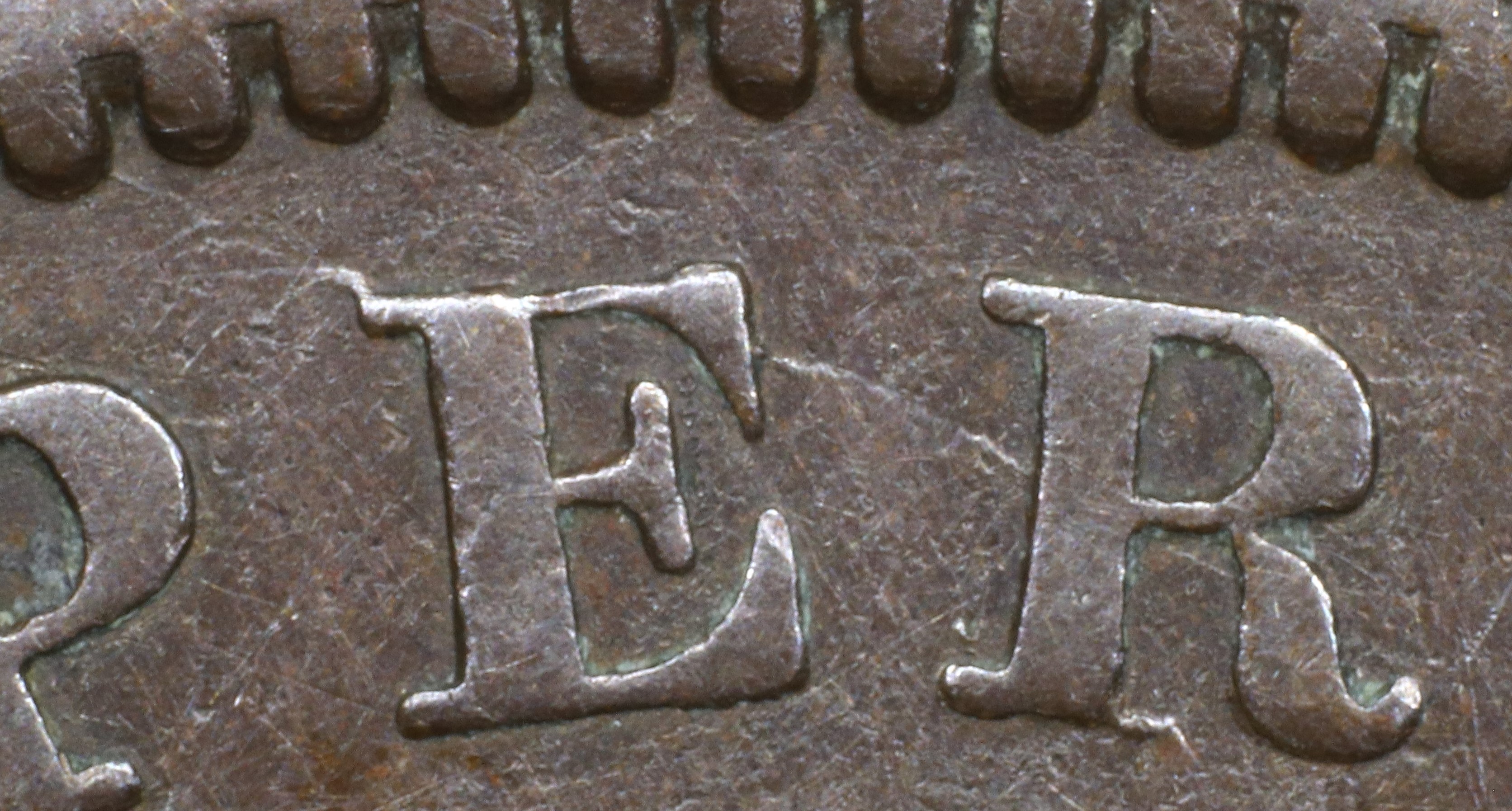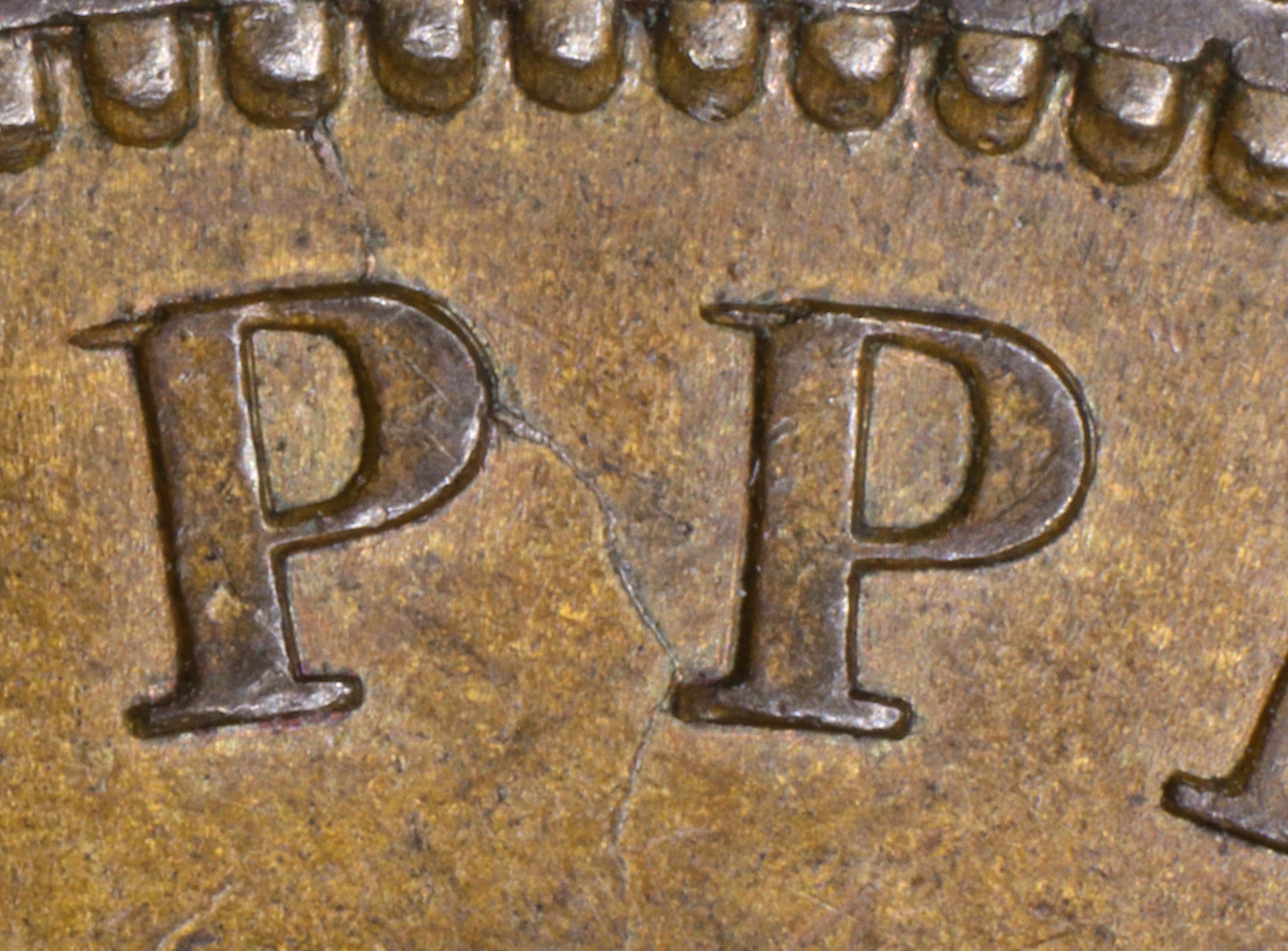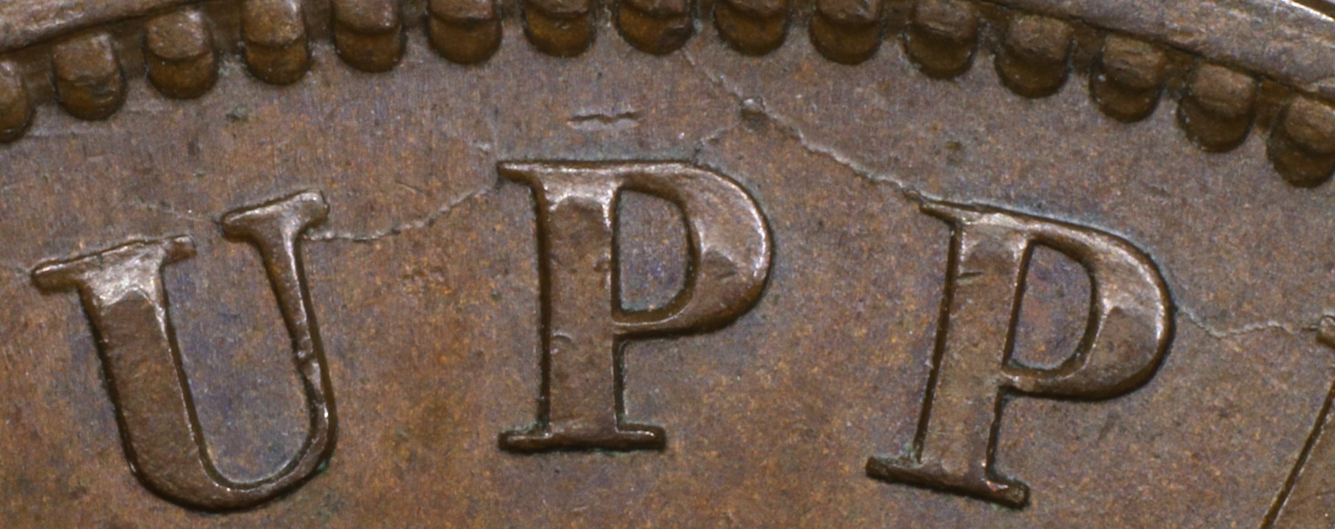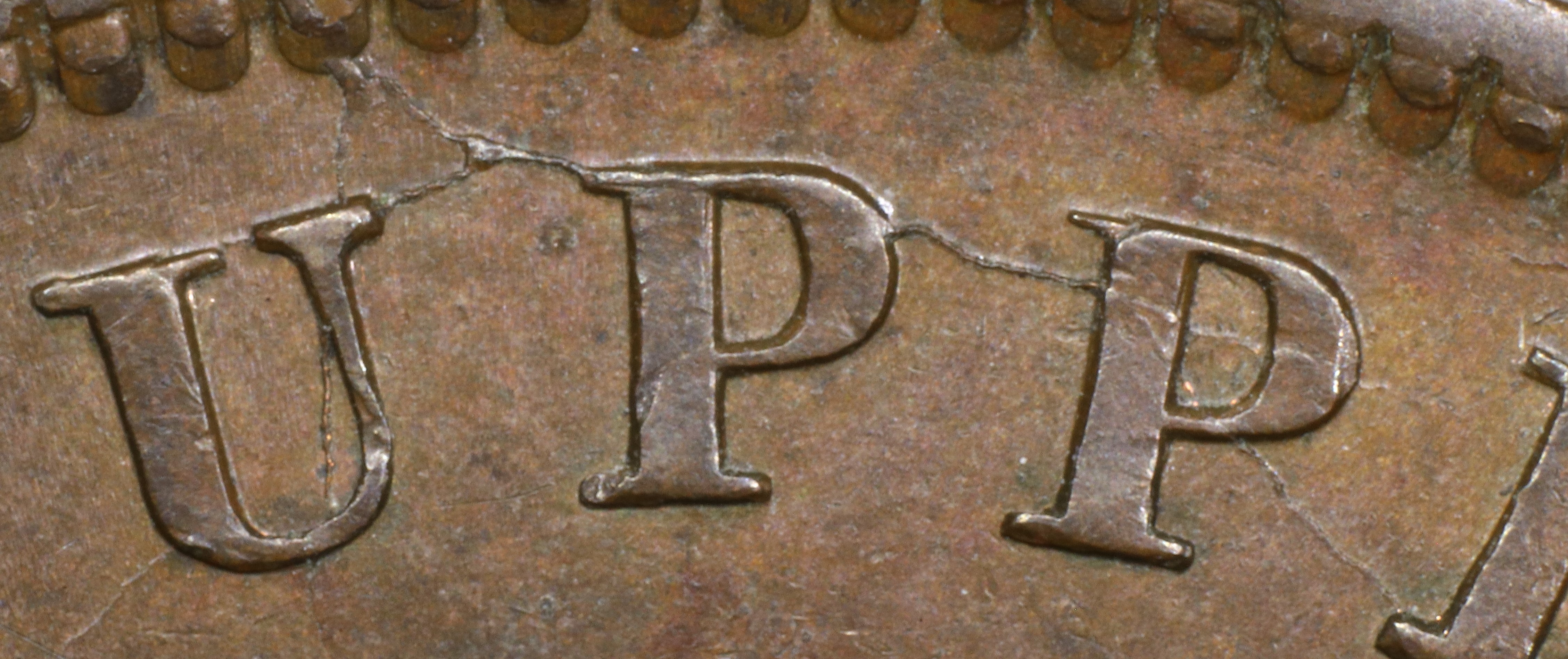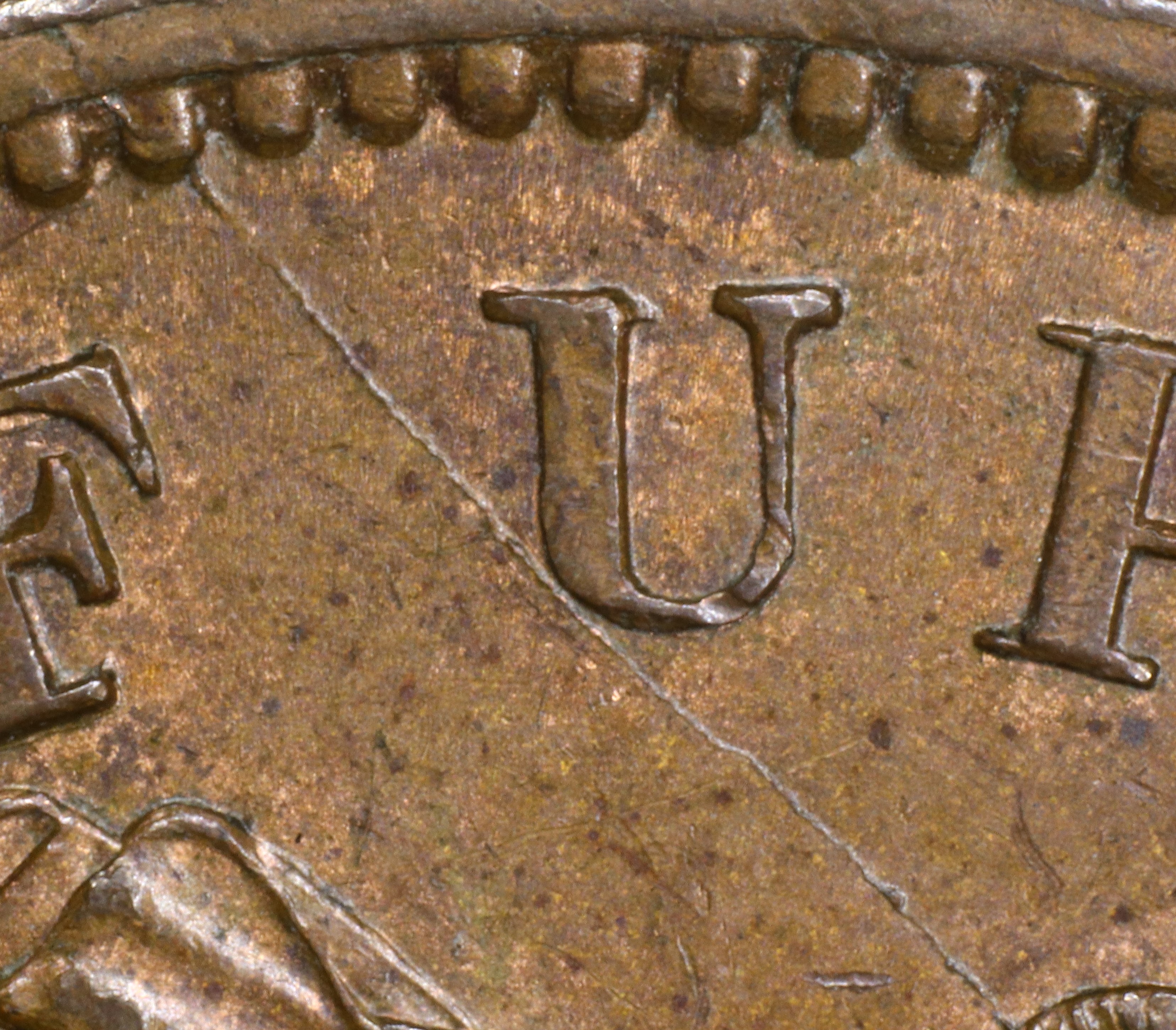 Compare the die crack detail in the UPPER area of your coin with the photos below. Remember that cracks can enlarge with die usage, so carefully compare the shape and location of the crack relative to the rim denticles and where it strikes the letter. If you find a match, click on the catalog number link above the photo to go to the home page for that catalog number. There you can check for other markers to confirm your tentative identification.
