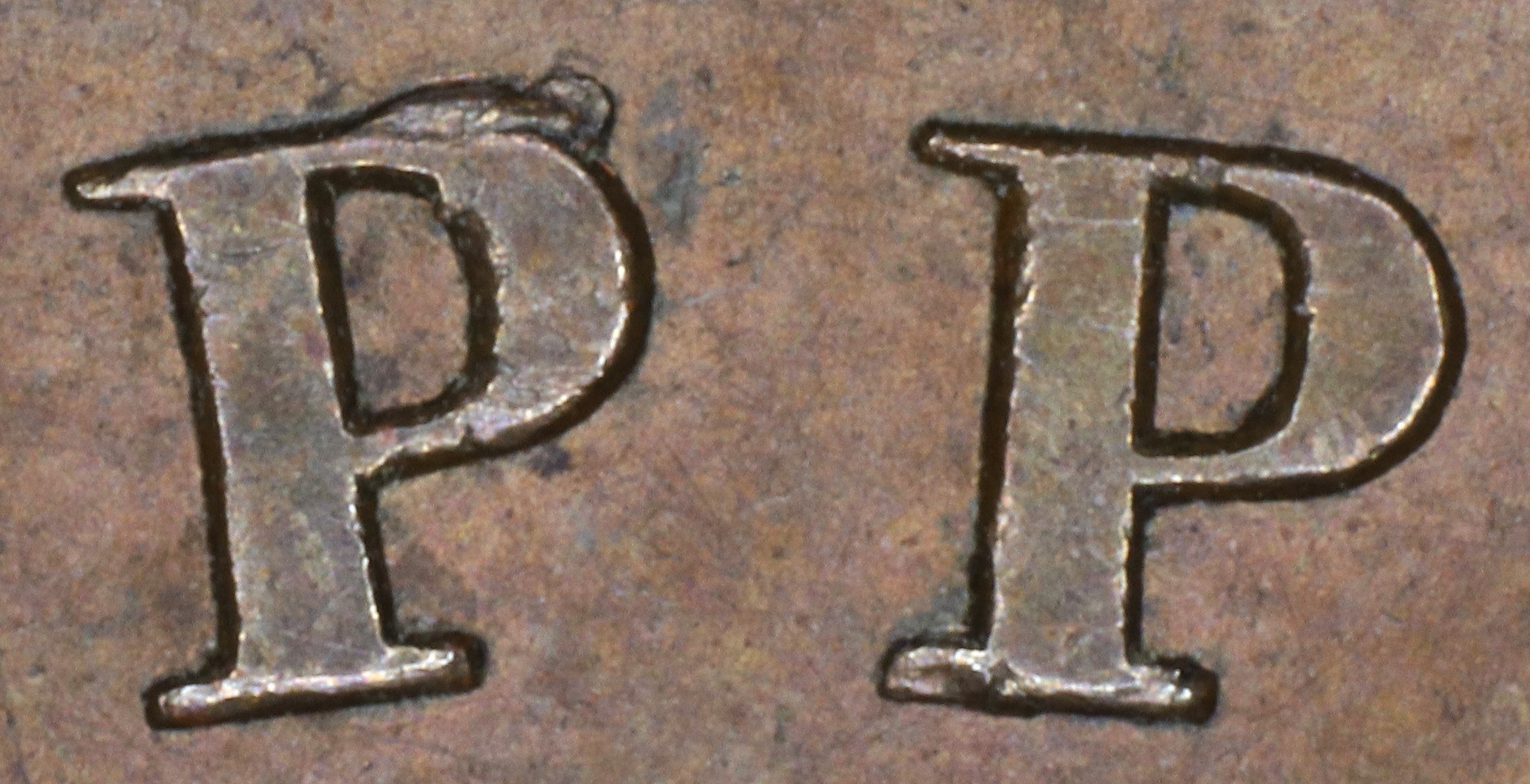 In UPPER the Ps are repunched in slightly lower relief in a new font with a tapering upper left serif (in the original font they were parallel). That feature had been broken off the original Ps.
