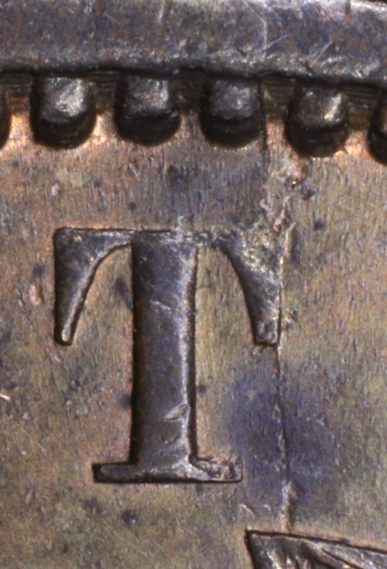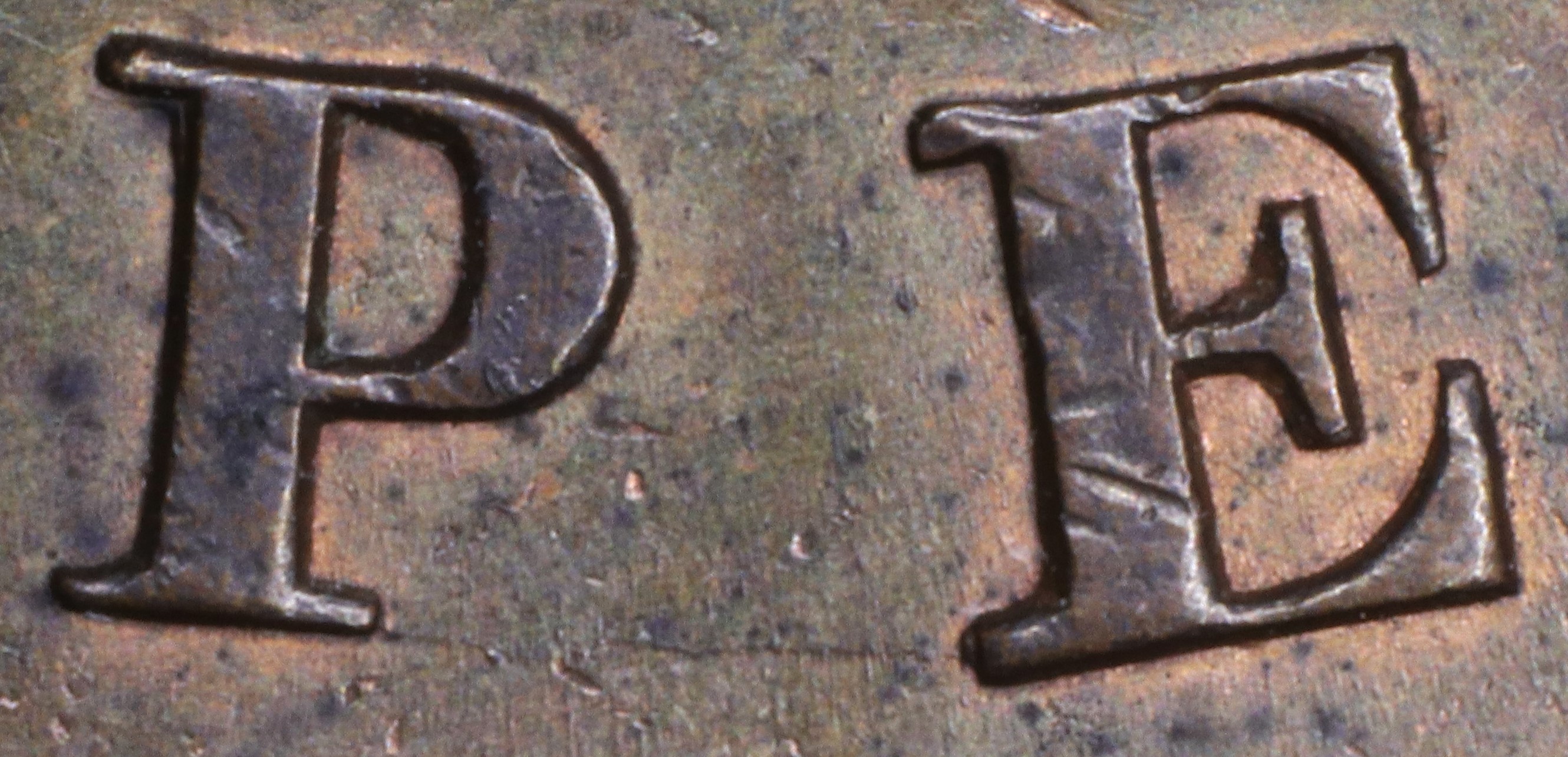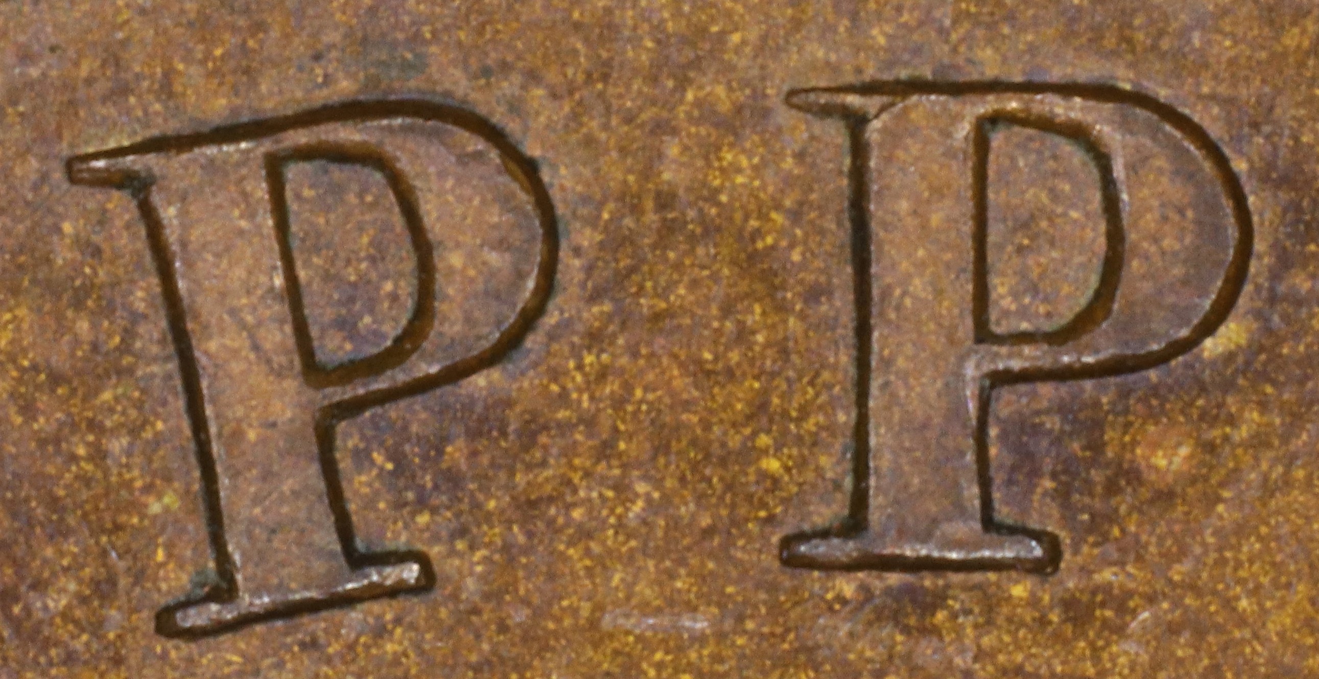In PENNY the Y is repunched slightly tilted, so the new serifs at the top of the left arm are lower than the broken top of the original letter.