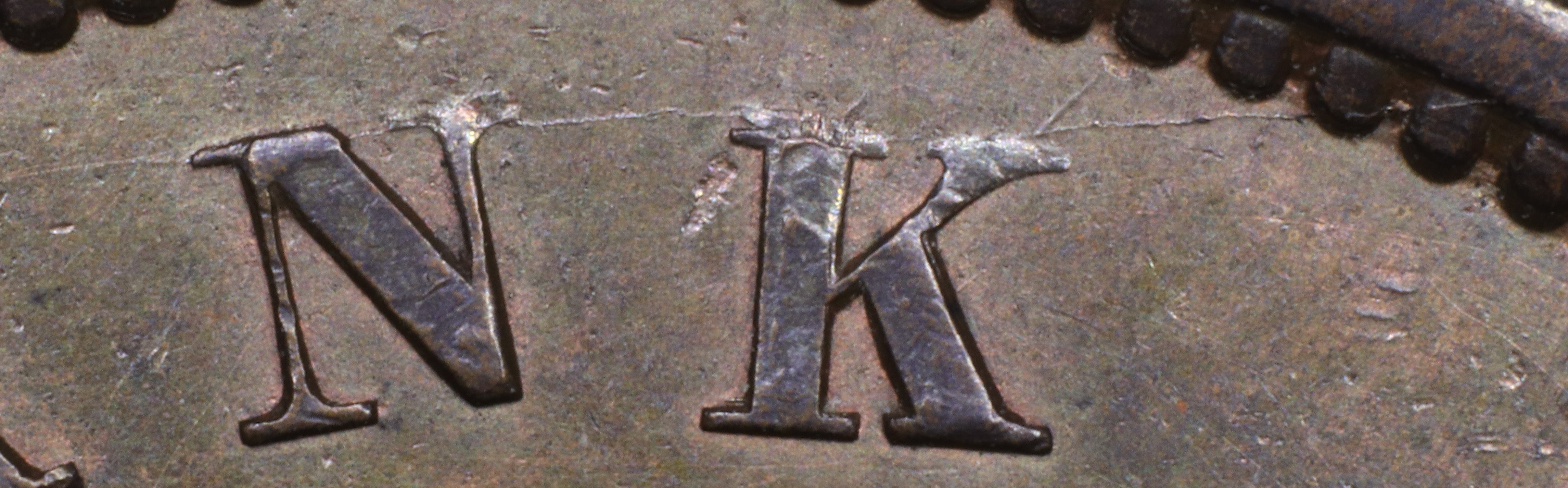 In BANK the N is repunched restoring the upper left serif, but not the serifs at the top of the right leg broken off the original font. Because the new letter was punched in slightly lower relief and slightly higher than the original, one can still see the broken edges of the original letter to the left of the serif and below the top of the original N.