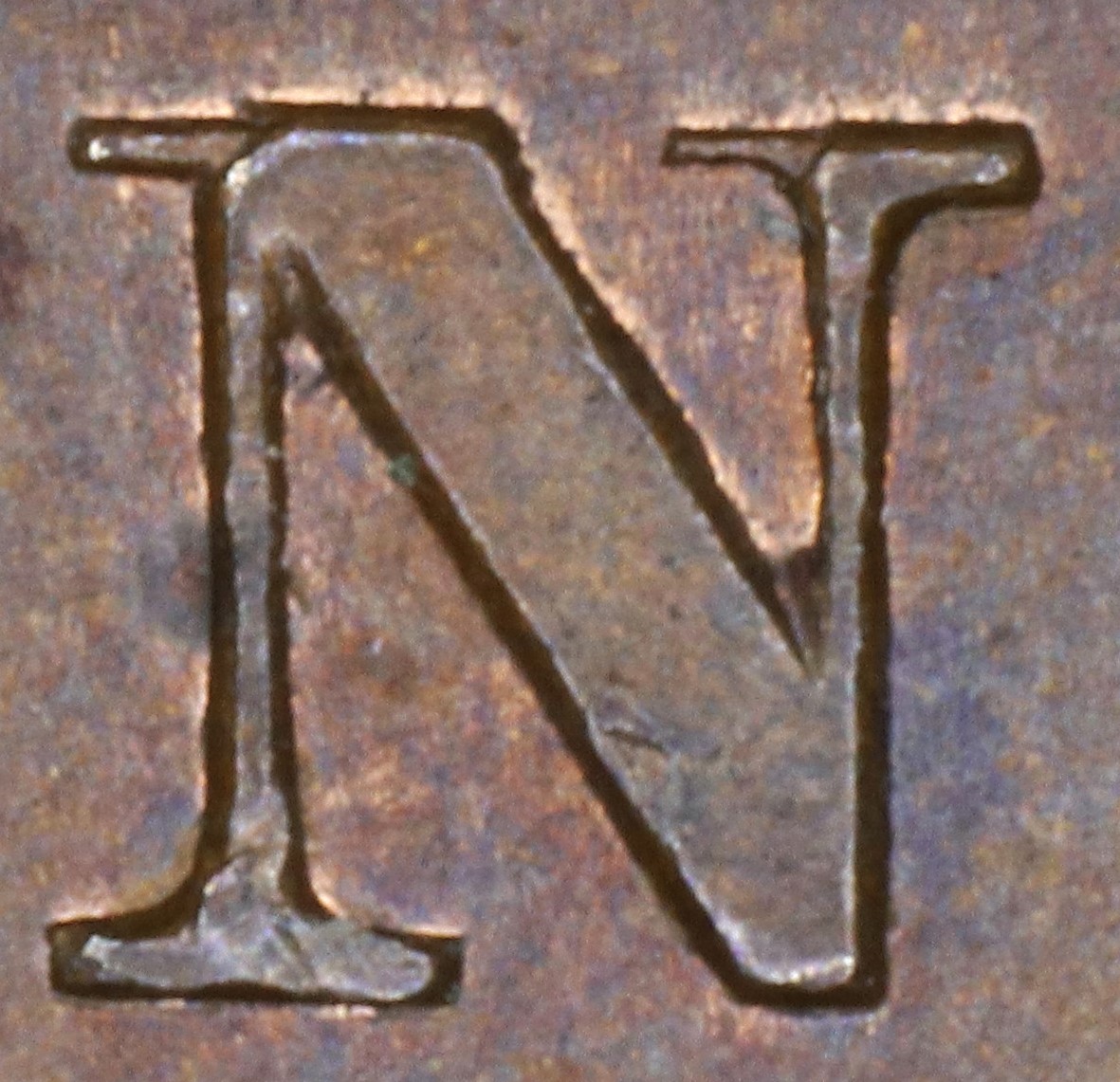 In BANK the N is repunched in lower relief in a new font with thin serifs. The upper left serif and left top of the right leg of the new font show where these features were missing in the original font.