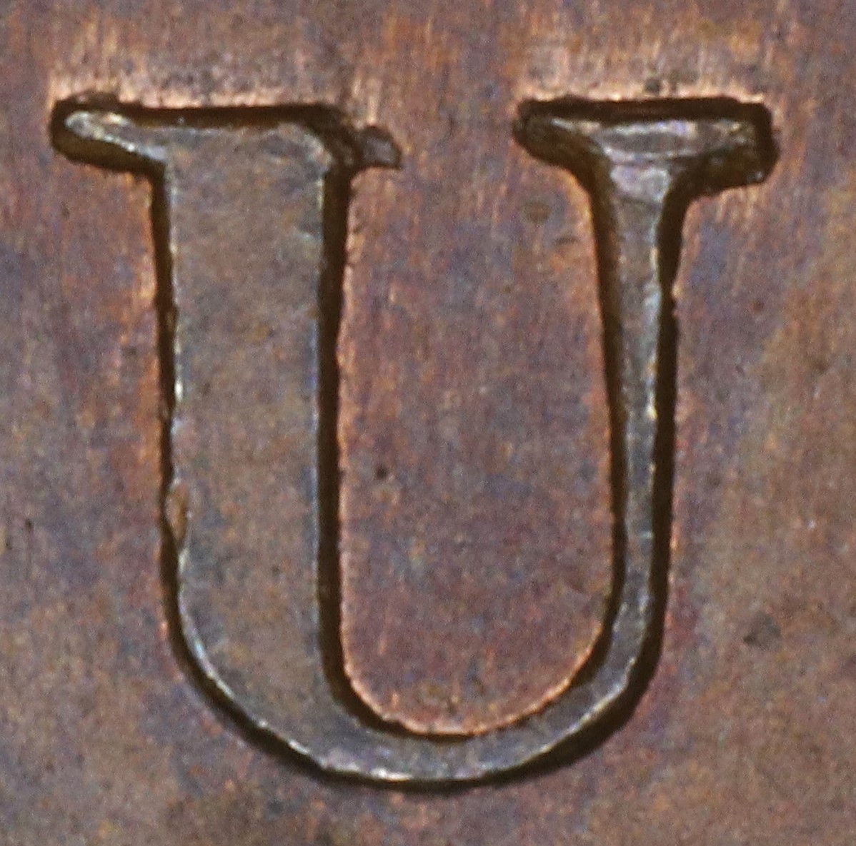 In UPPER the E is repunched in lower relief, leaving the upper left serif doubled and showing the ragged bottom of the original upright and broken lower crossbar.