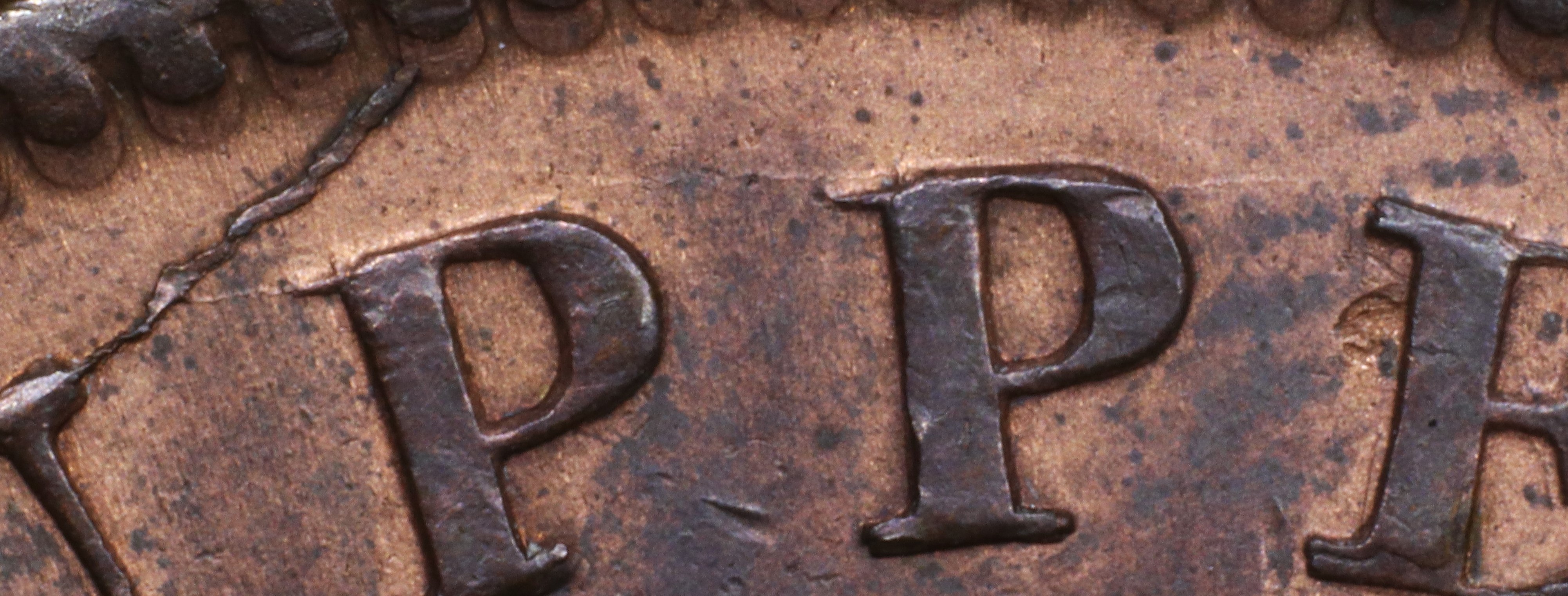 In UPPER the Ps are repunched in slightly lower relief in a new font slightly tapering upper left serifs (in the original font they were parallel). The serifs of the new font show because they had broken off the original.