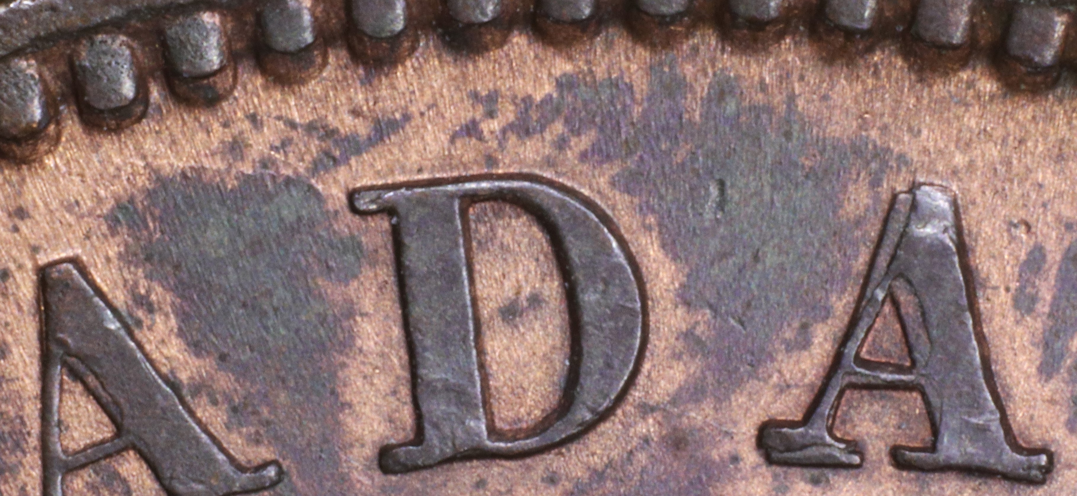 In CANADA the A has been repunched in low relief and slightly tilted compared to the original faulty letter. This causes doubling at the upper outside left of the left leg, at the left foot and along the right upright side in the central triangle.