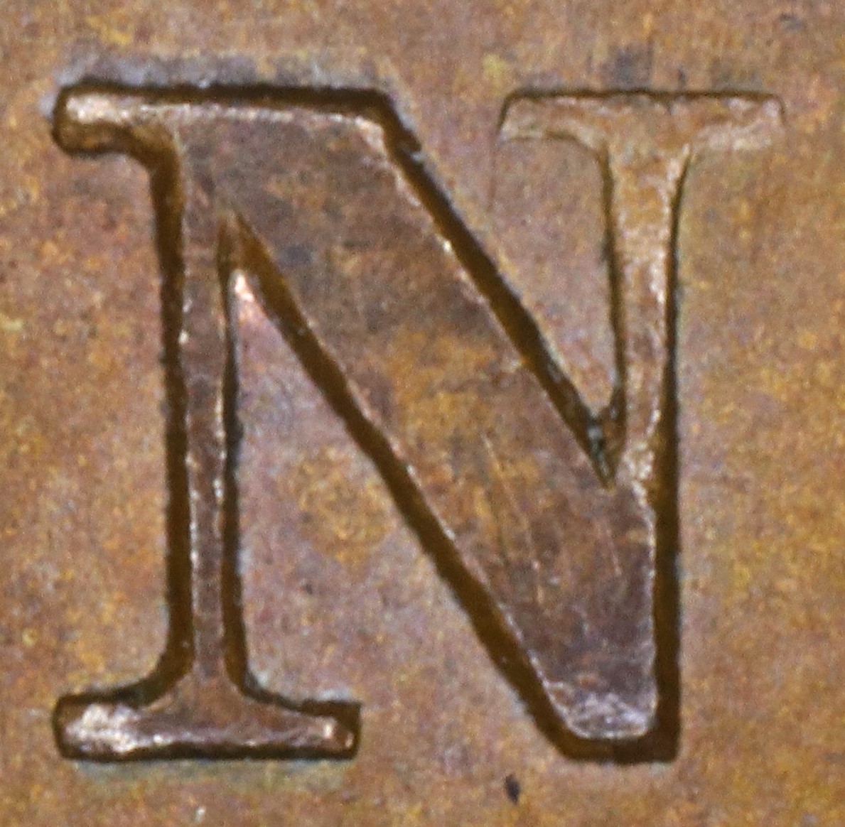 In BANK the N is repunched in slightly lower relief in a new font with very thin serifs. The serifs of the new font show in the broken areas of the original broken letter: the upper left serif and left top of the right leg.