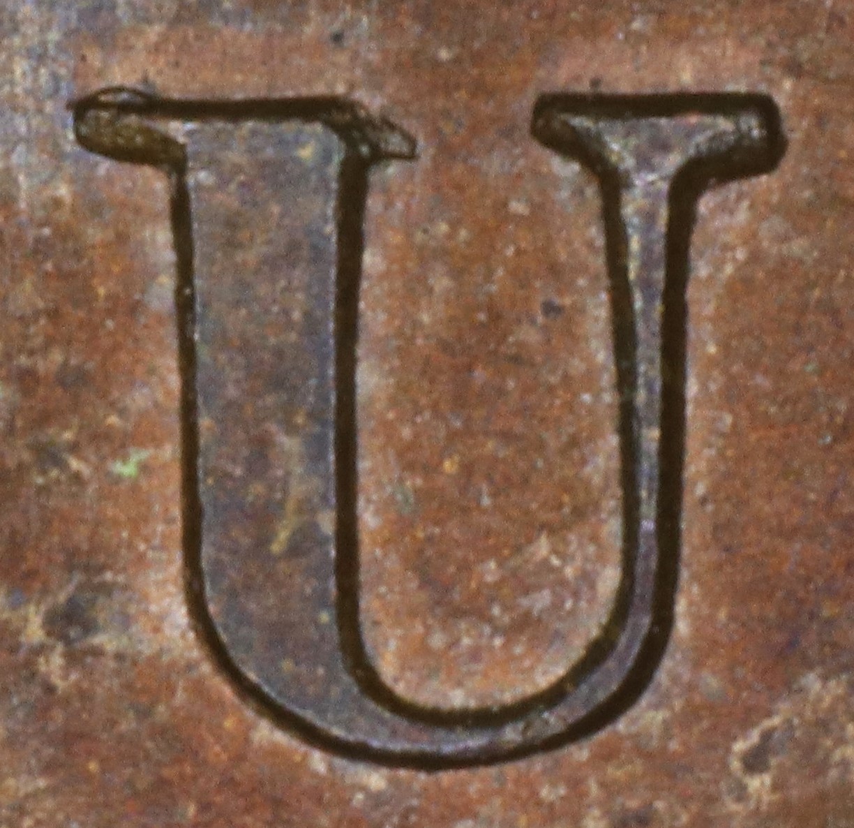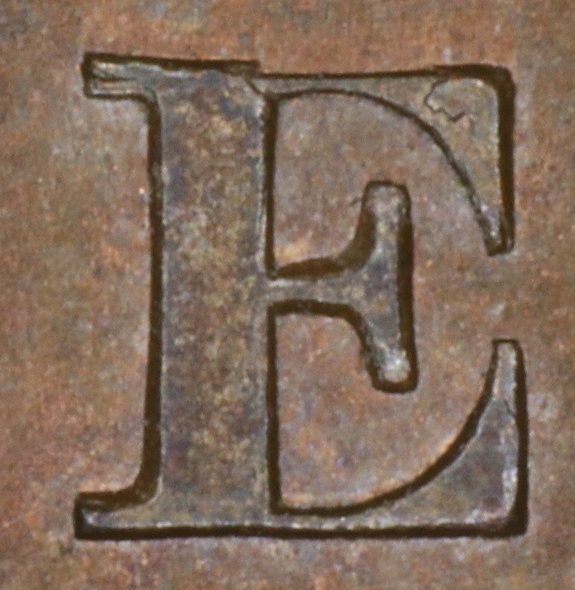 In UPPER the original E with a broken top arm has been repunched in lower relief, so that on higher grade examples one can still see the broken edges of the gap in the top arm and doubling of the upper left serif.