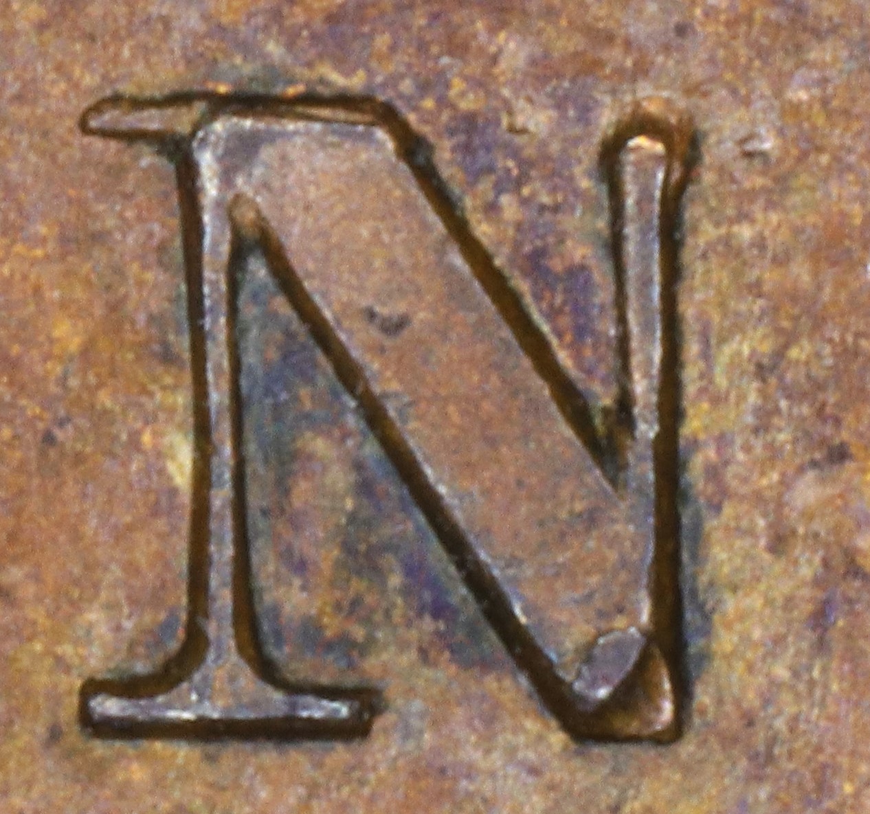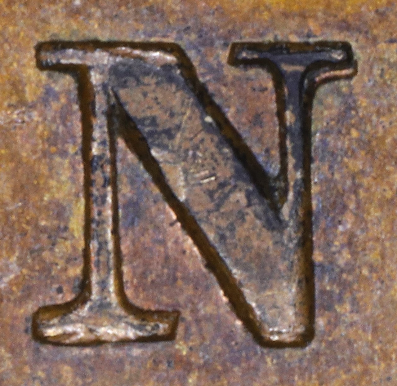 In BANK the N is repunched restoring the upper left serif, but not the serifs at the top of the right leg broken off the original font. Because the new letter was punched in slightly lower relief and slightly higher than the original, one can still see the broken edges of the original letter to the left of the serif and below the top of the original N.