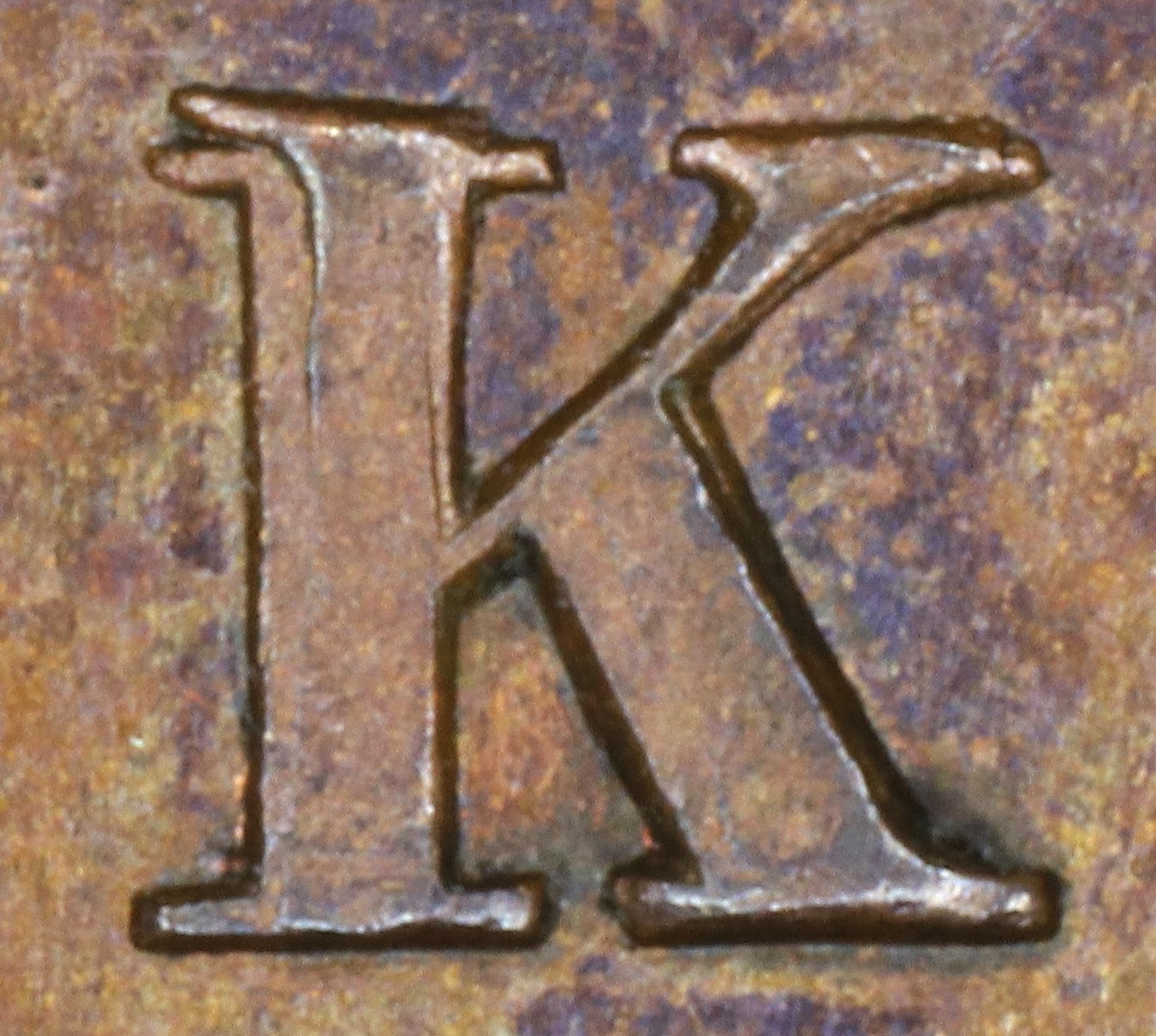 In BANK the K is repunched tilted to the upper back, restoring the upper right serif at the top of the upright that had broken off the original letter. The tilted repunch caused doubling of the left serif and upper back of the upright.