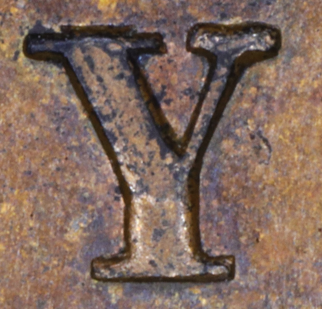 In PENNY the Y is repunched slightly tilted, so the new serifs at the top of the left arm are lower than the broken top of the original letter.